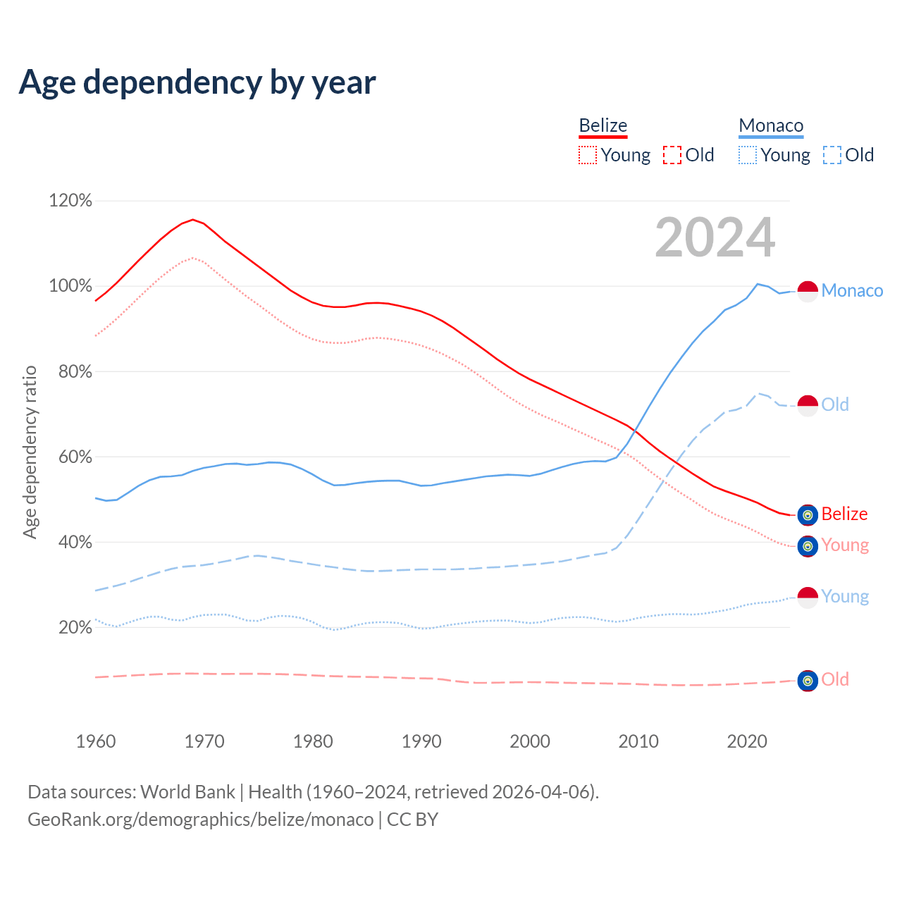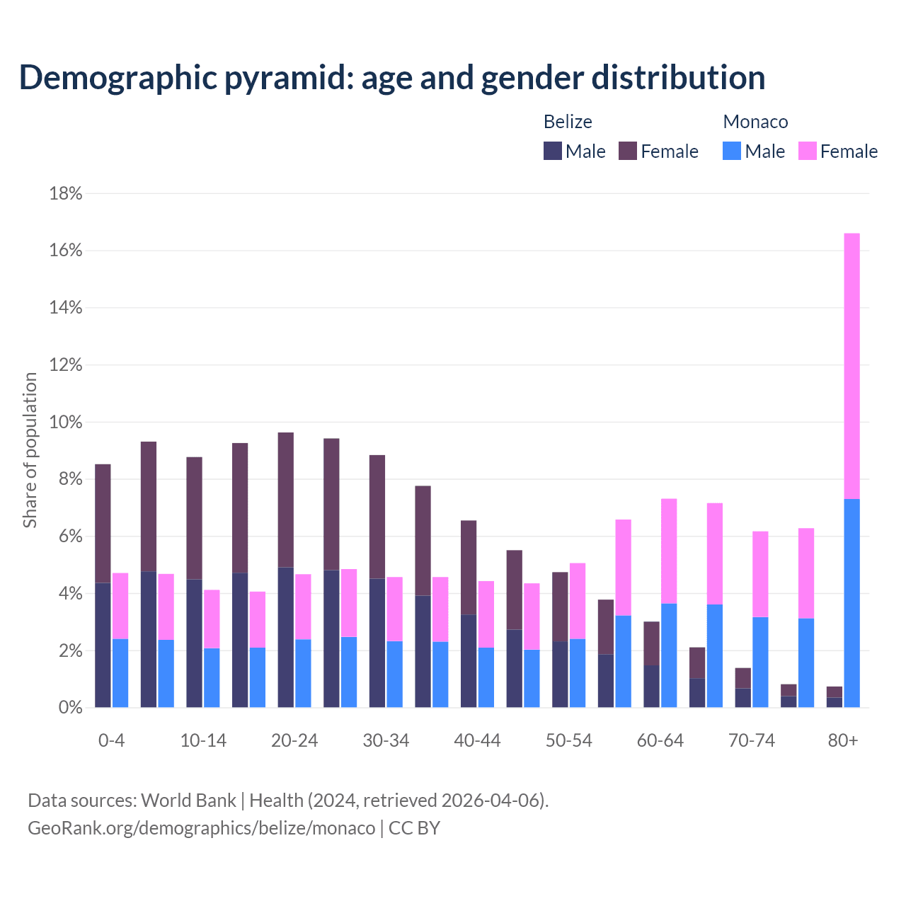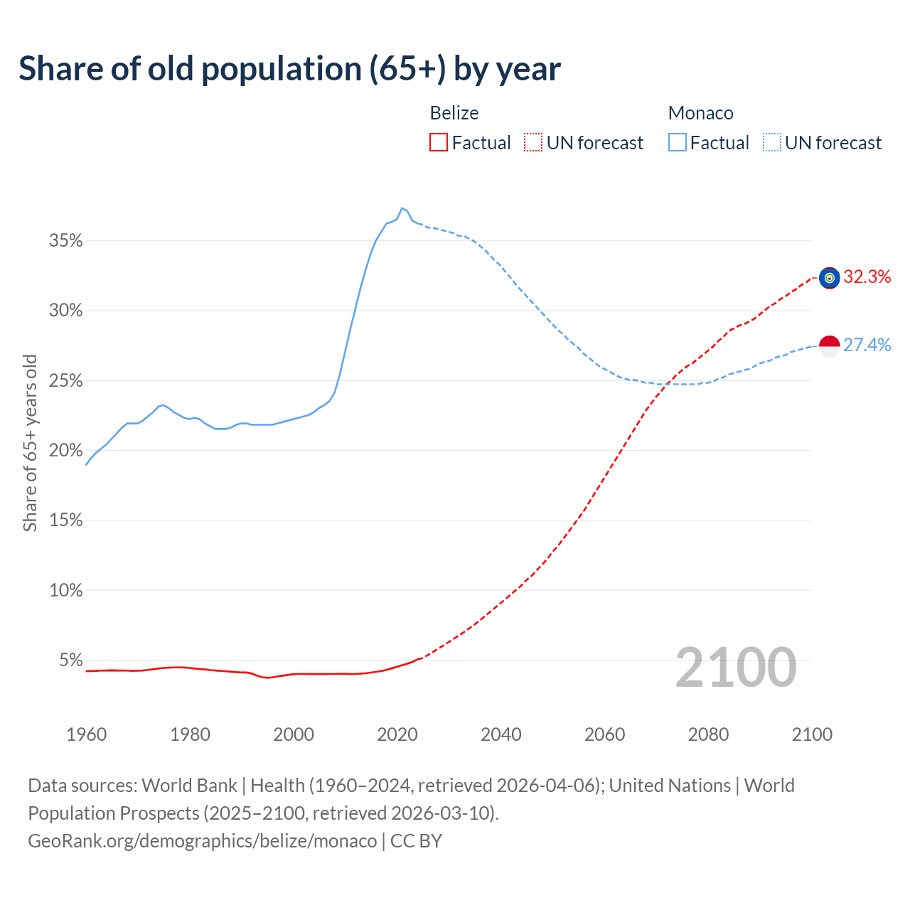 - The share of old-age demographic (65+) in Belize is 5.02% vs 36.2% in Monaco.