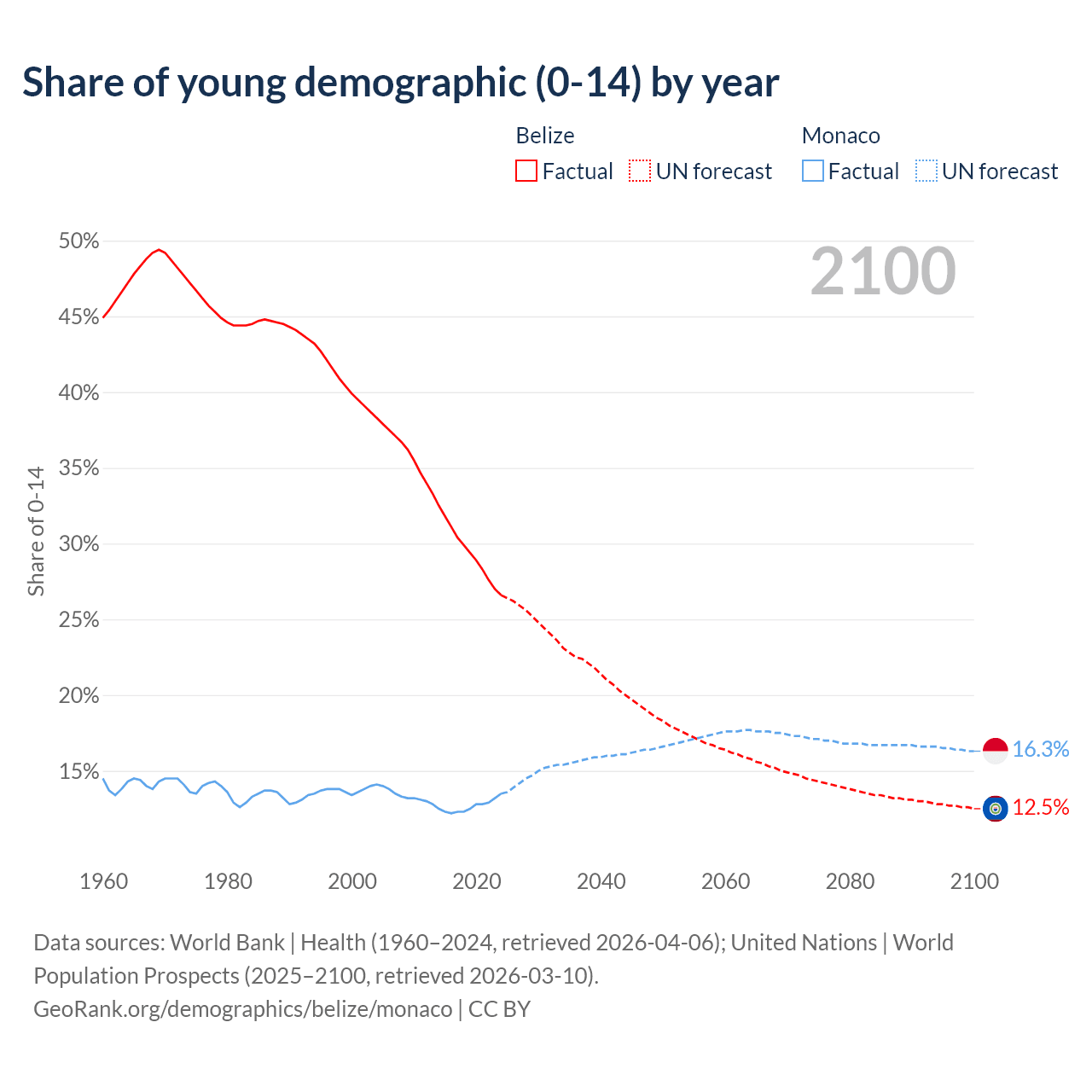 - The share of young demographic (0-15 years old) in Belize is 26.6% vs 13.5% in Monaco.