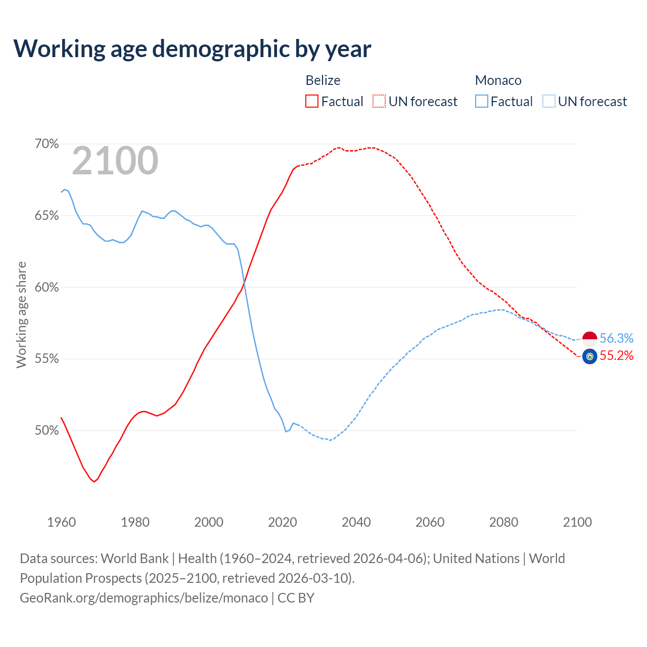 - Belize has 294K working age adults (aged 15-64) vs 19.2K in Monaco.