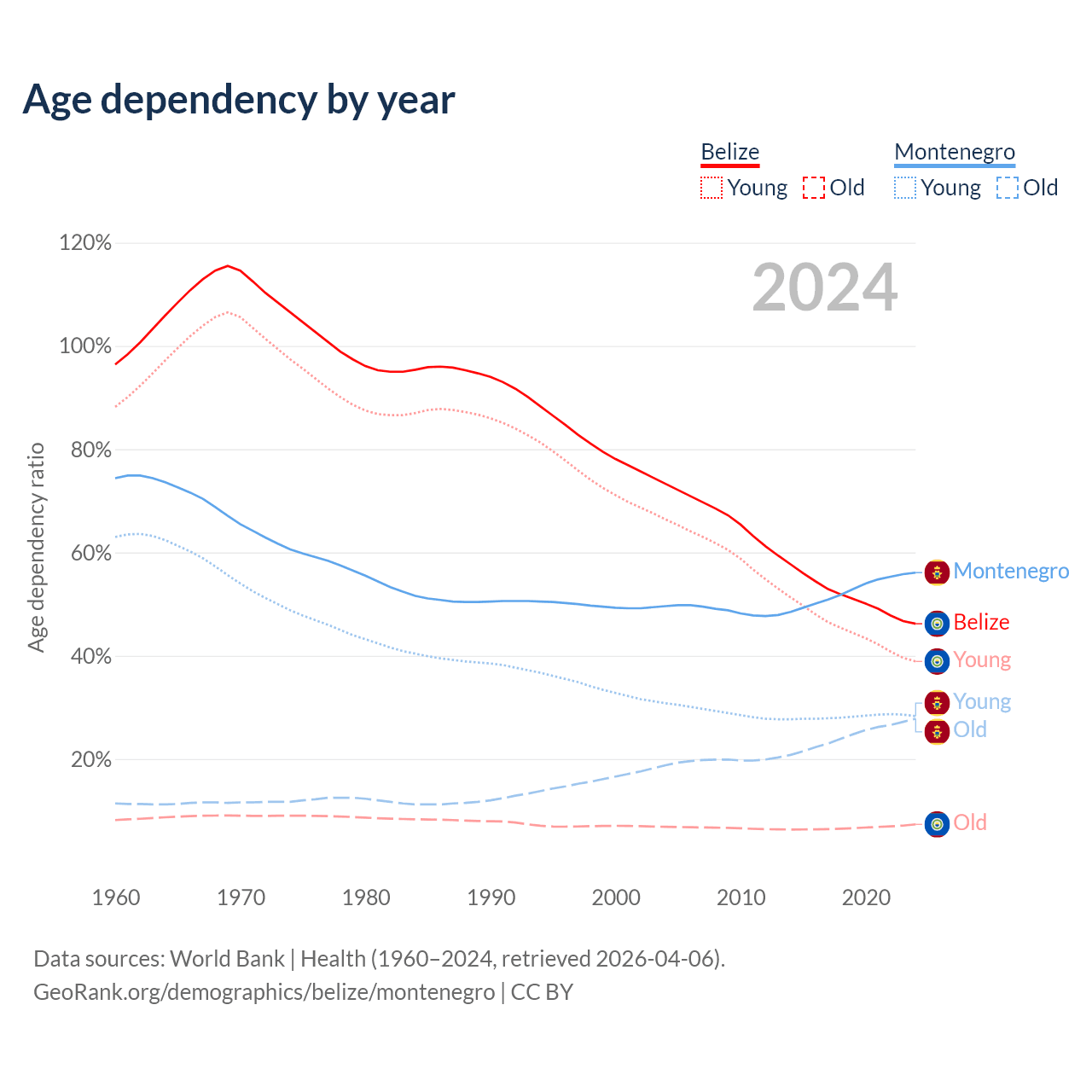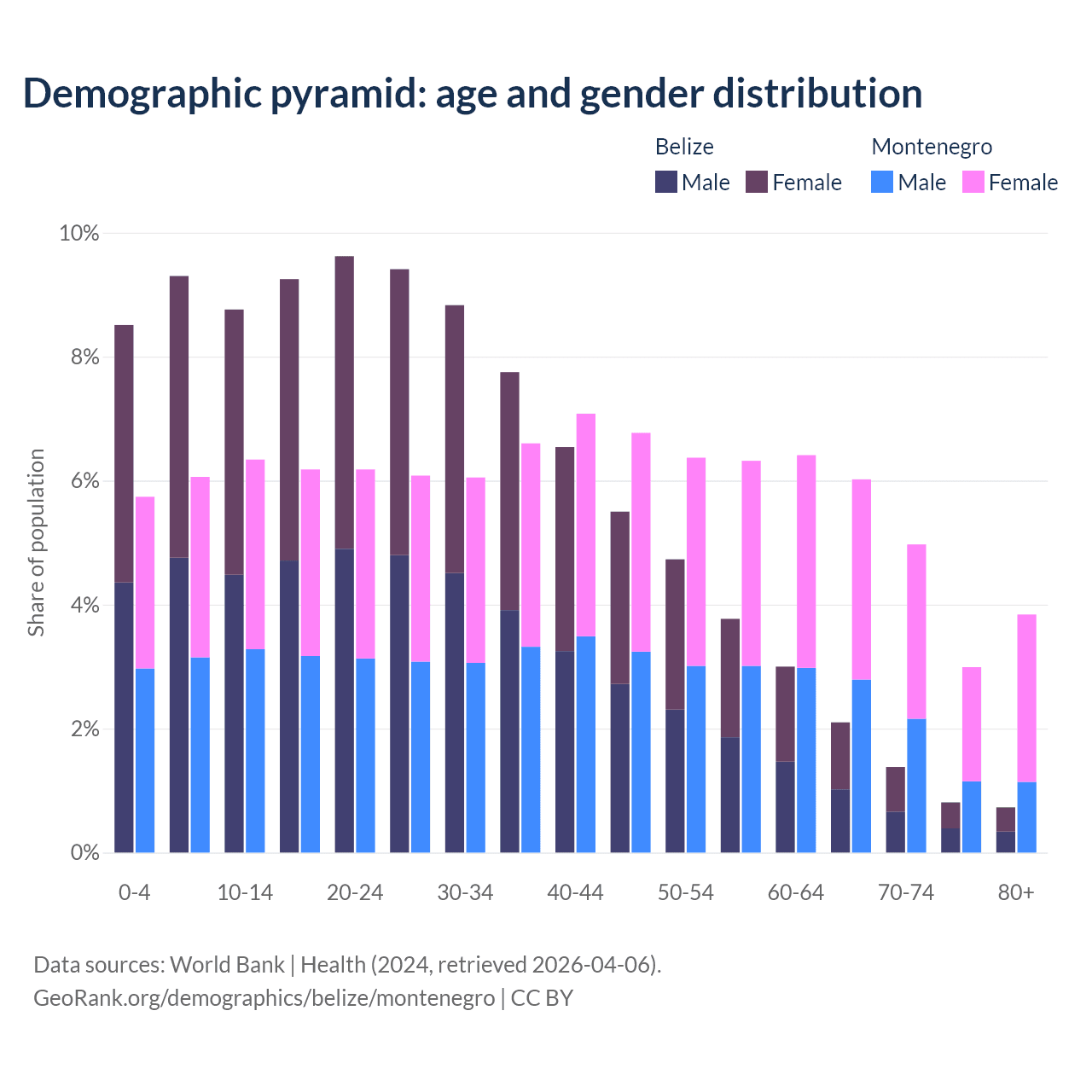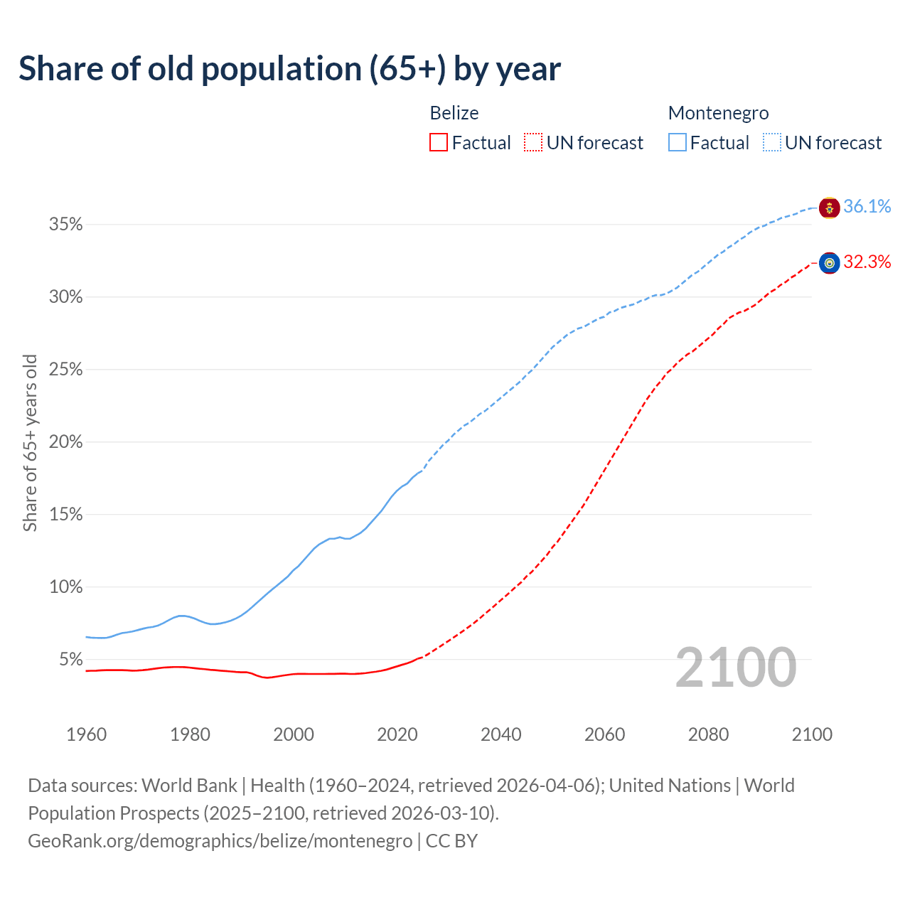 - The share of old-age demographic (65+) in Belize is 5.02% vs 17.8% in Montenegro.