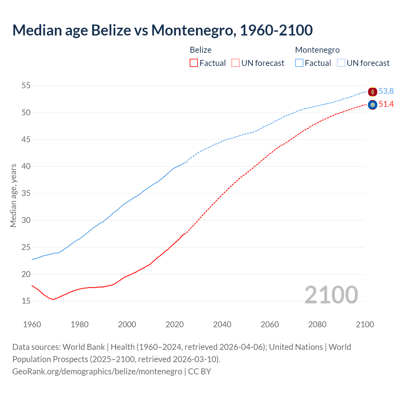 - The median age in Belize is 27.4 years compared to 40.6 years in Montenegro.