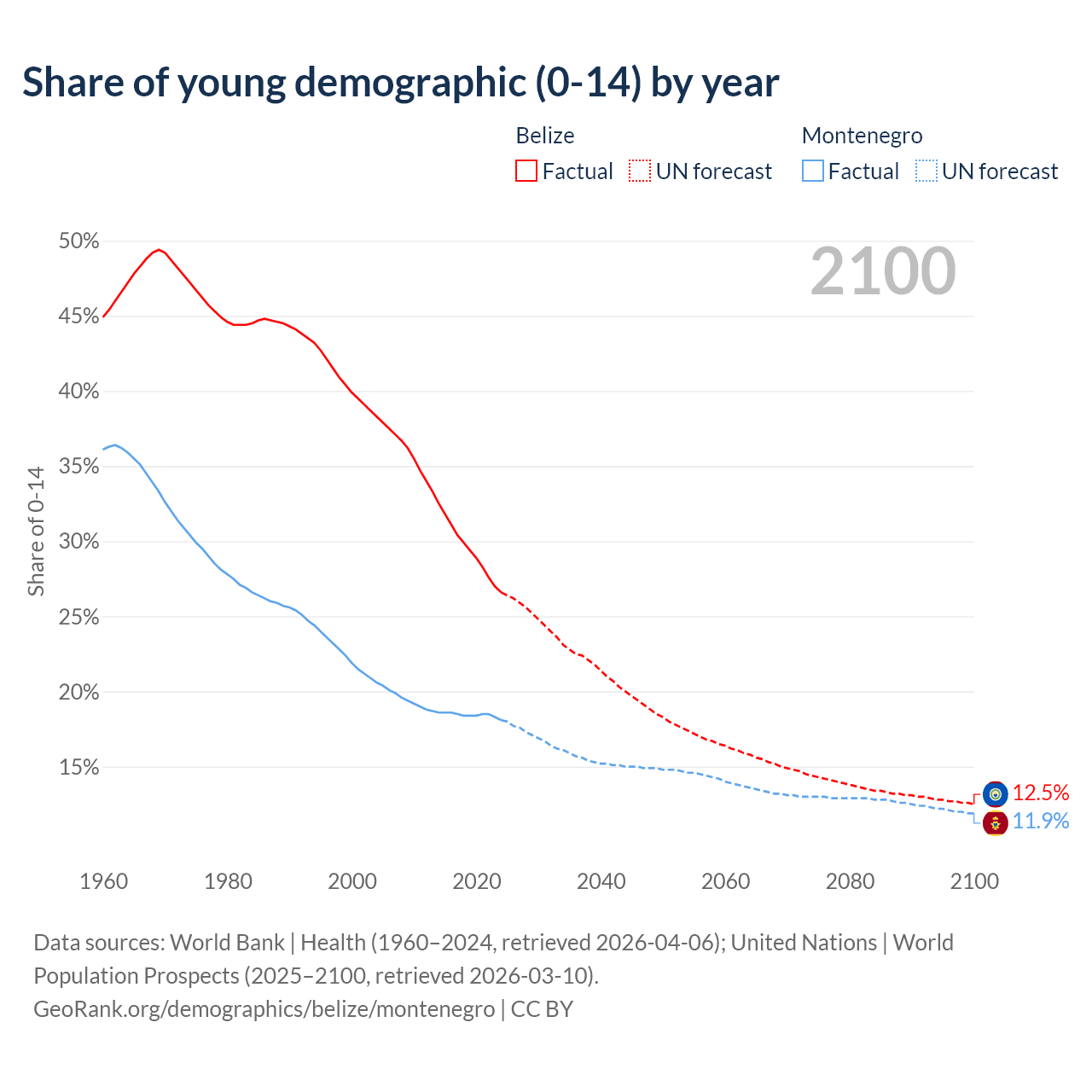 - The share of young demographic (0-15 years old) in Belize is 26.6% vs 18.1% in Montenegro.