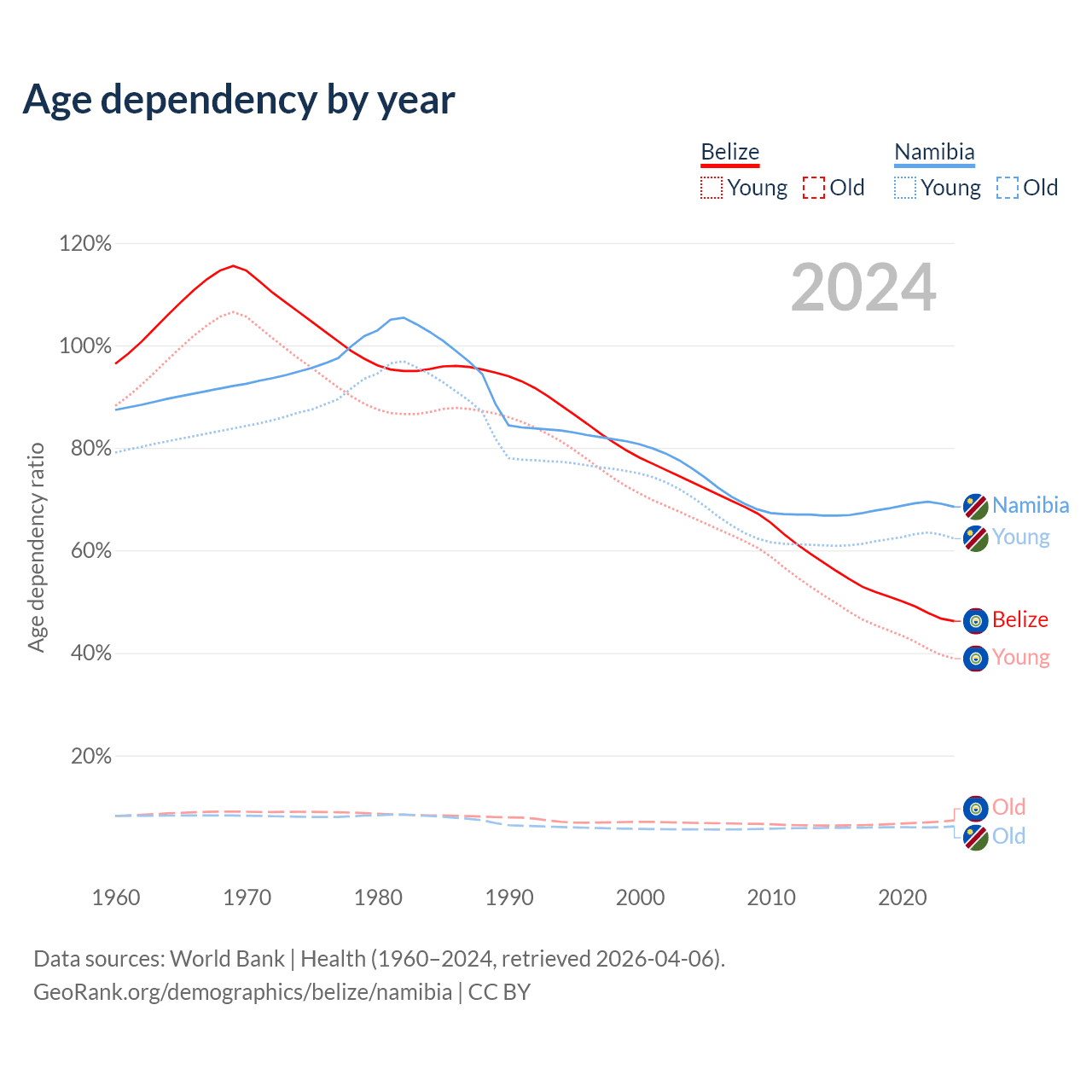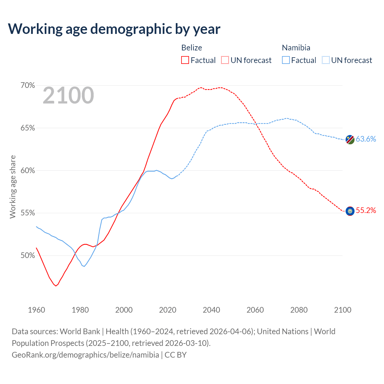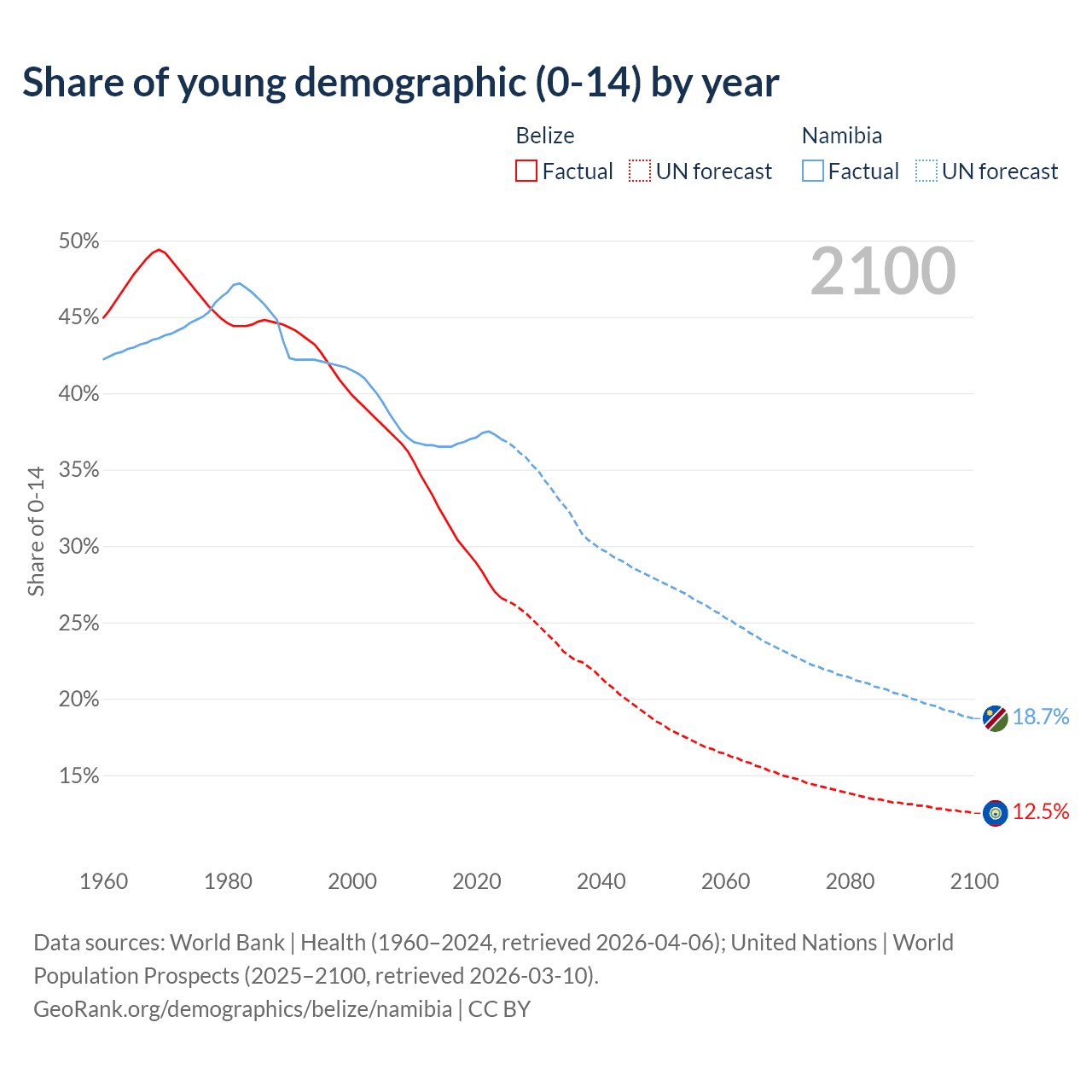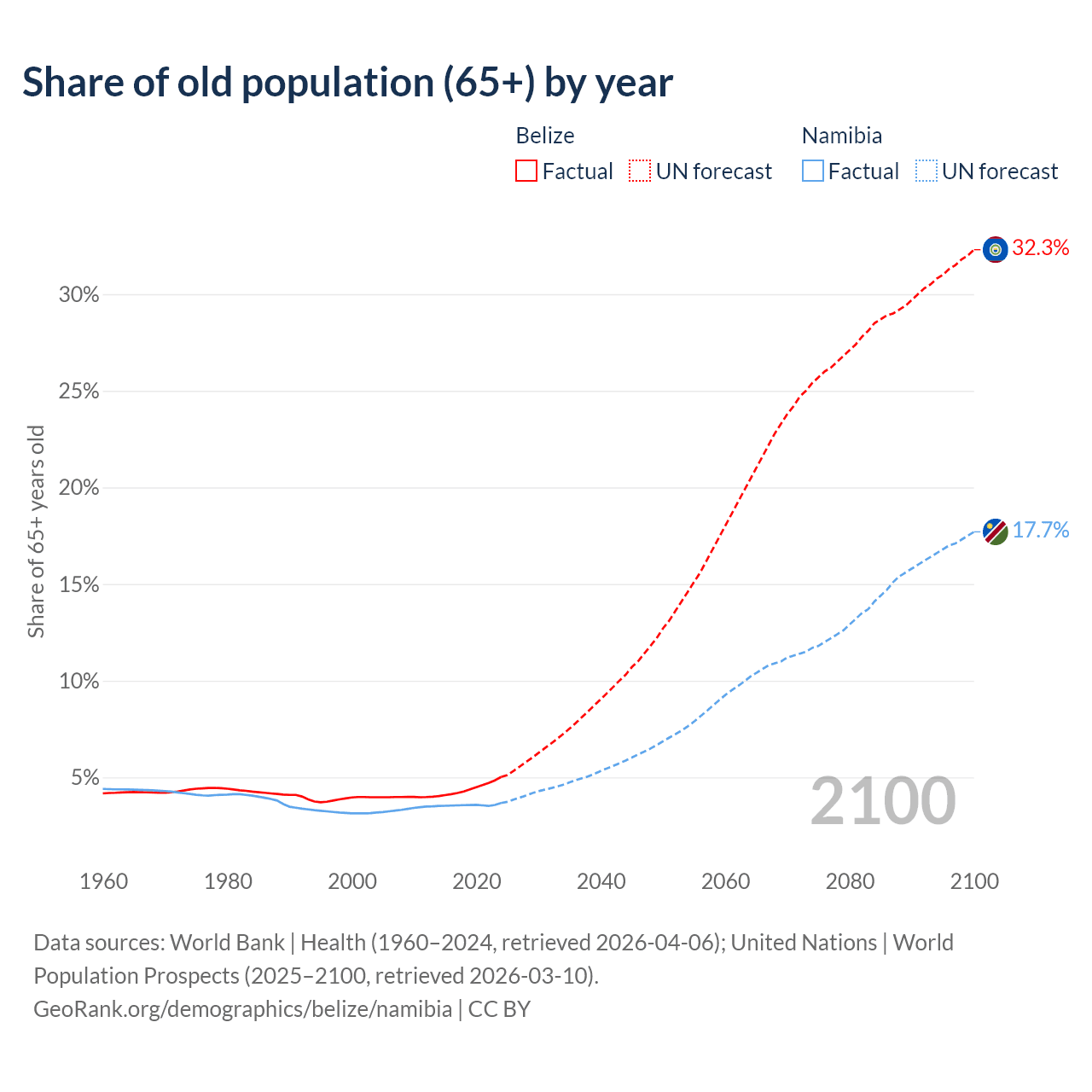 - The share of old-age demographic (65+) in Belize is 5.02% vs 3.67% in Namibia.