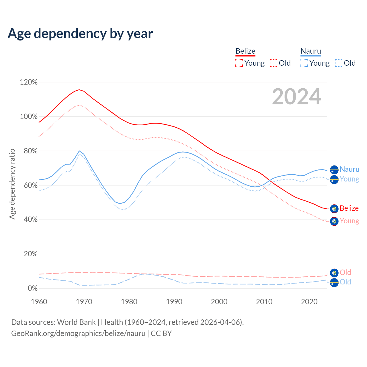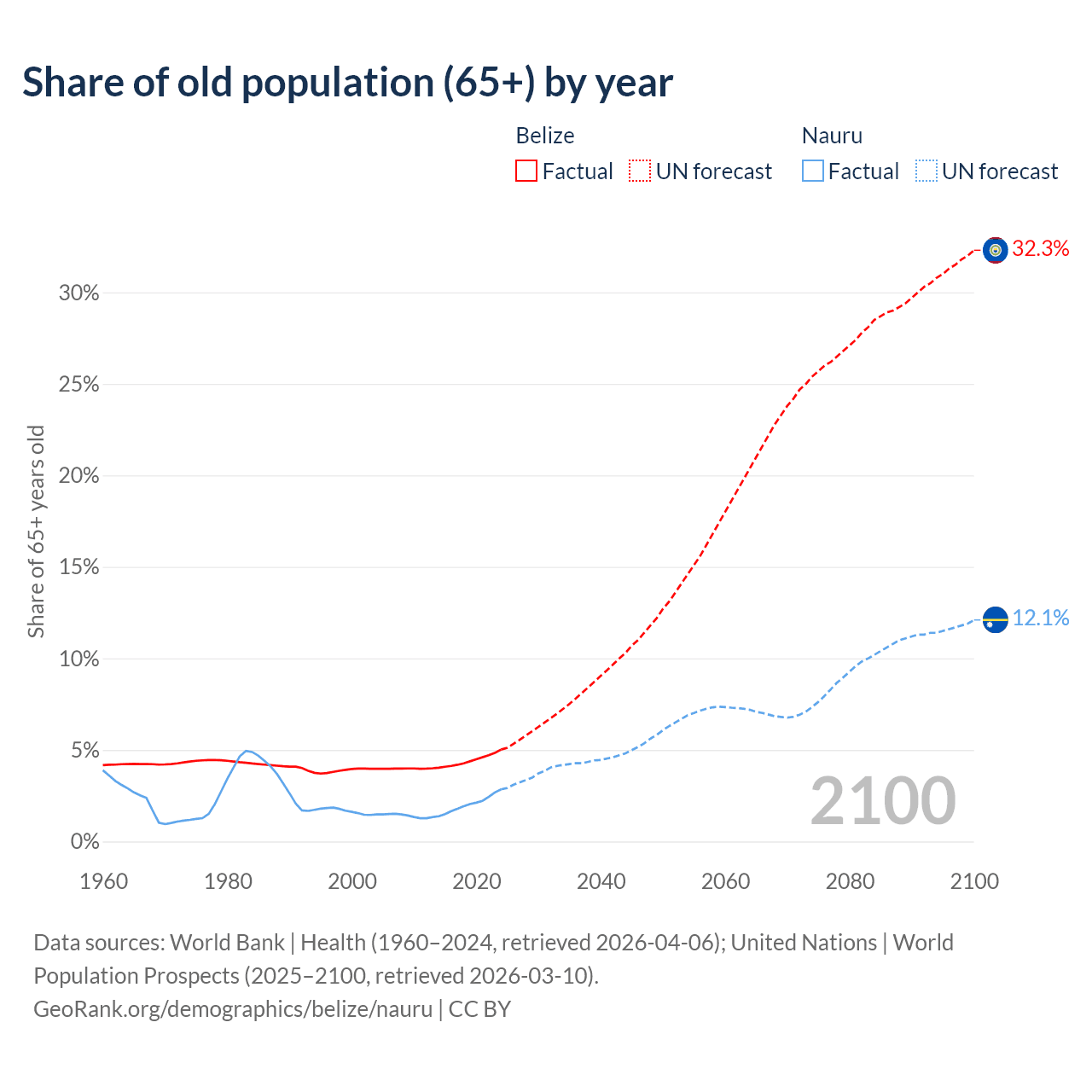 - The share of old-age demographic (65+) in Belize is 5.02% vs 2.85% in Nauru.