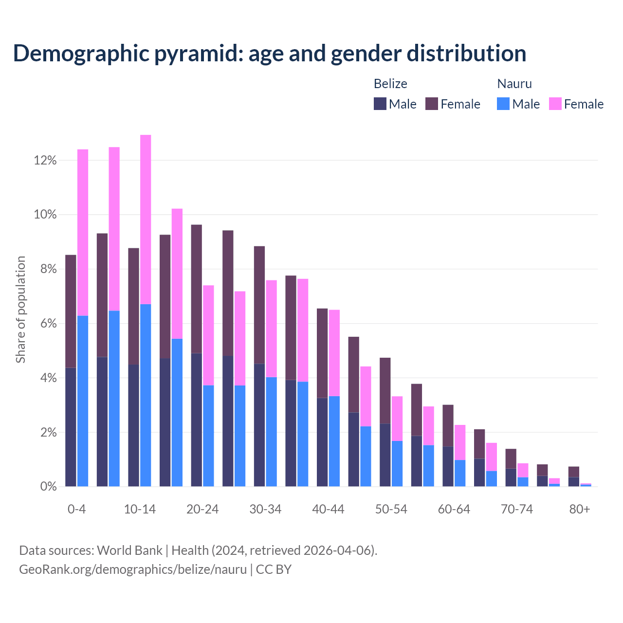 - As of 2026, the population of Belize is 430K vs 12.1K in Nauru - 35.5 times difference.