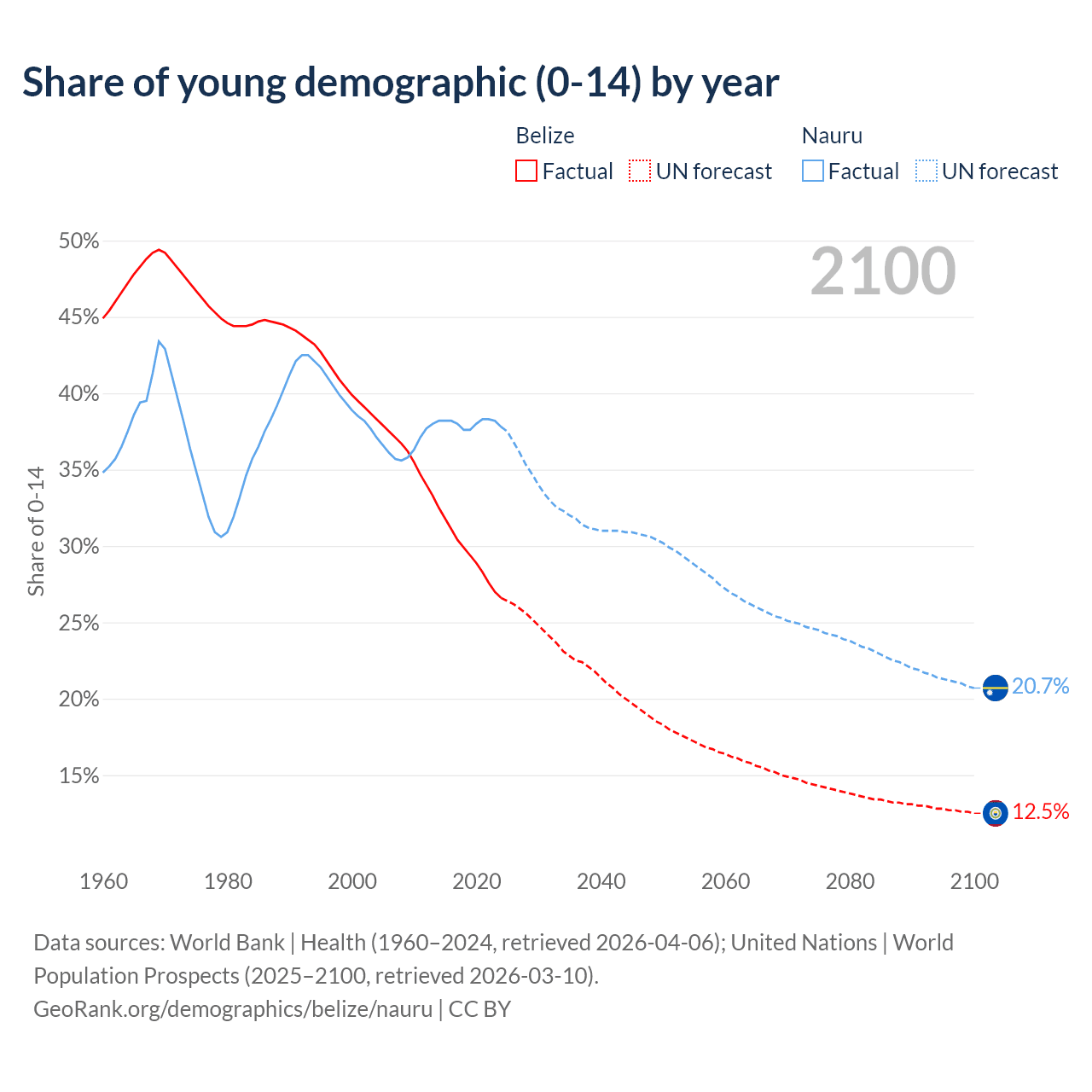 - The share of young demographic (0-15 years old) in Belize is 26.6% vs 37.8% in Nauru.