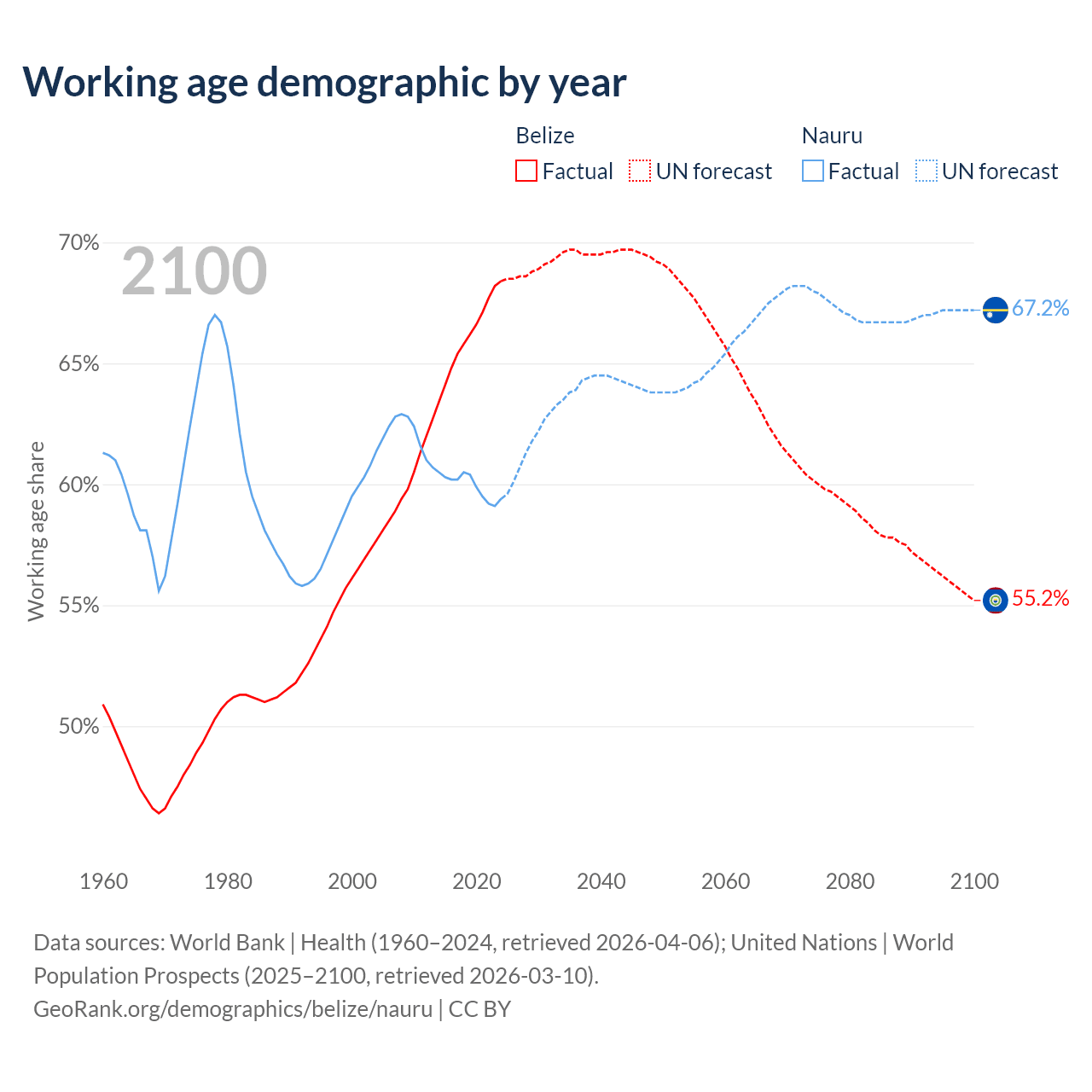 - Belize has 294K working age adults (aged 15-64) vs 7.2K in Nauru.