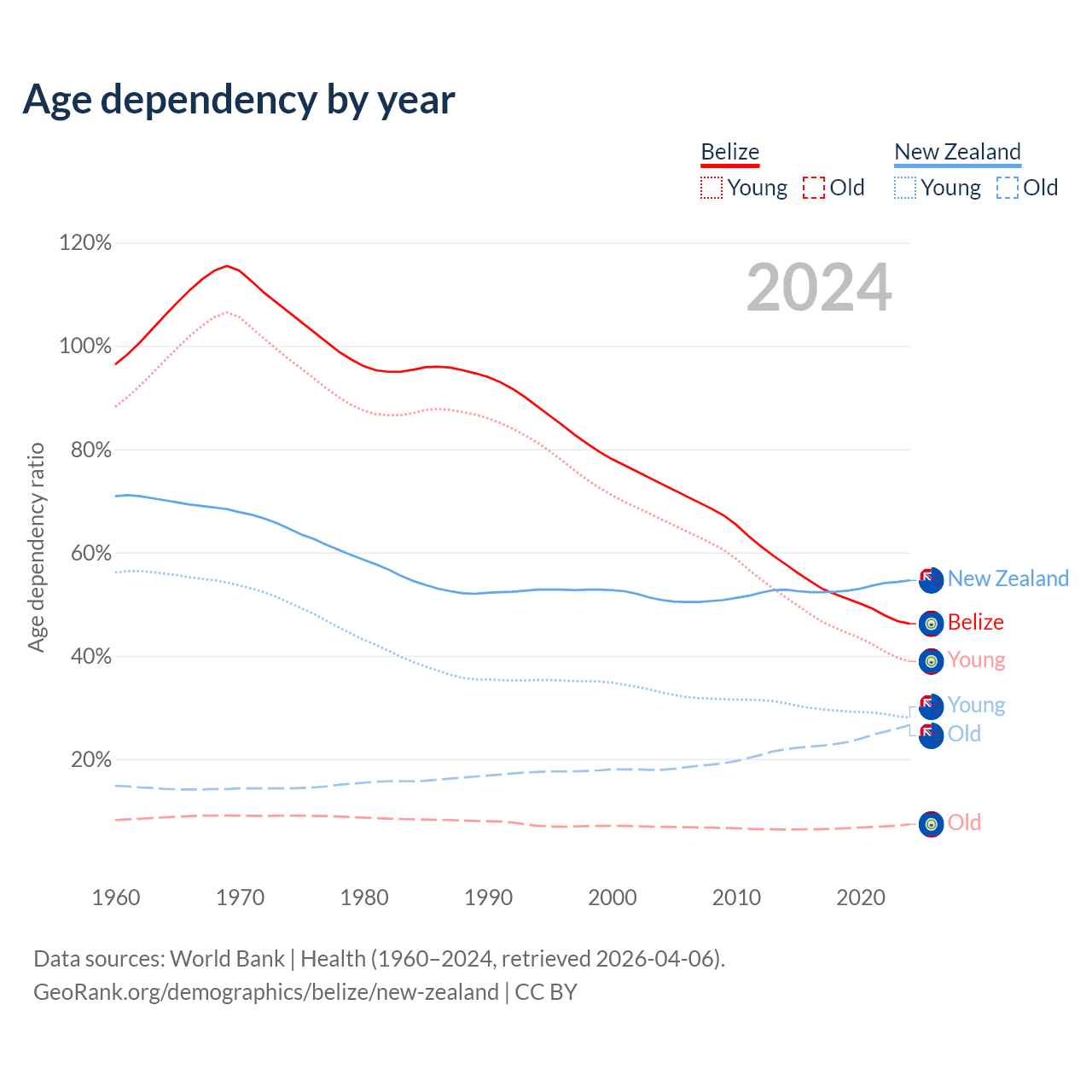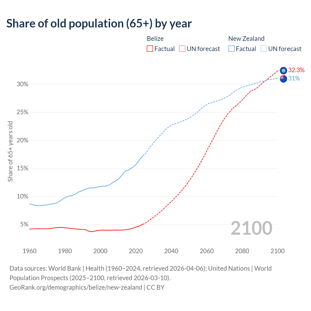 - The share of old-age demographic (65+) in Belize is 5.02% vs 17.2% in New Zealand.
