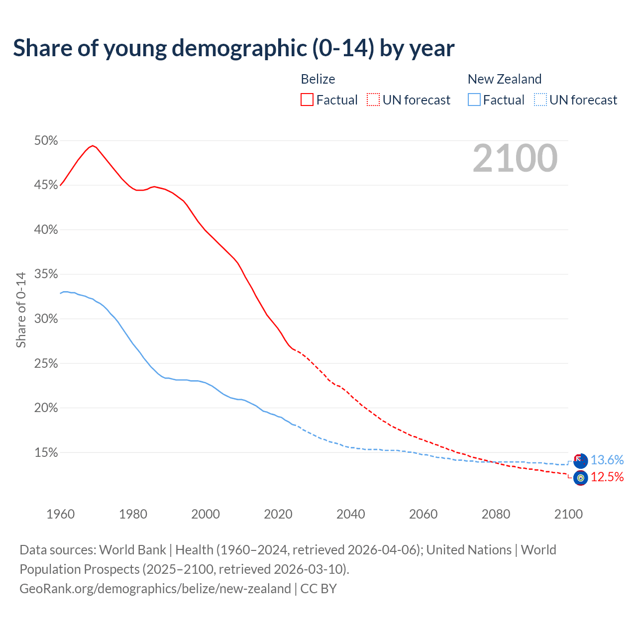 - The share of young demographic (0-15 years old) in Belize is 26.6% vs 18.1% in New Zealand.