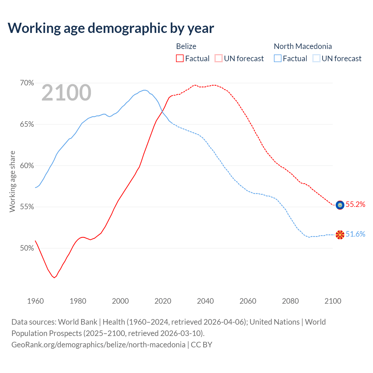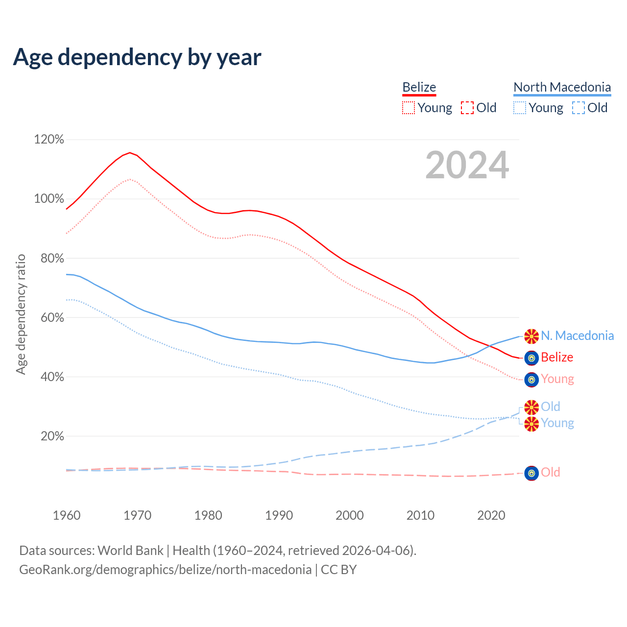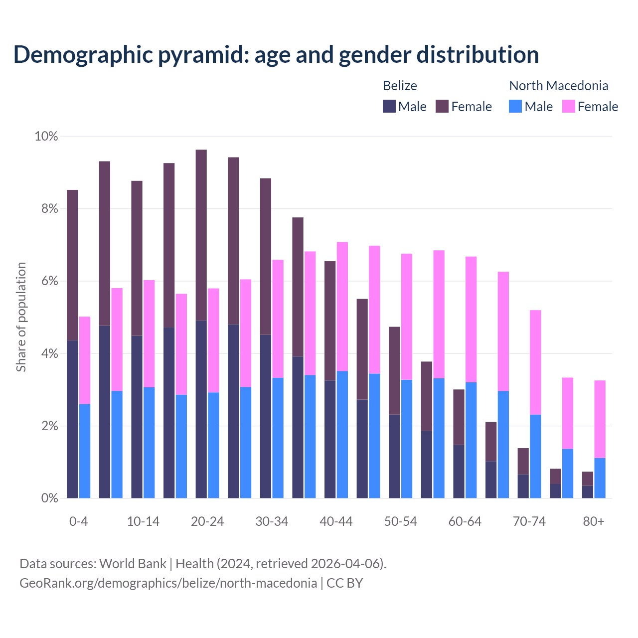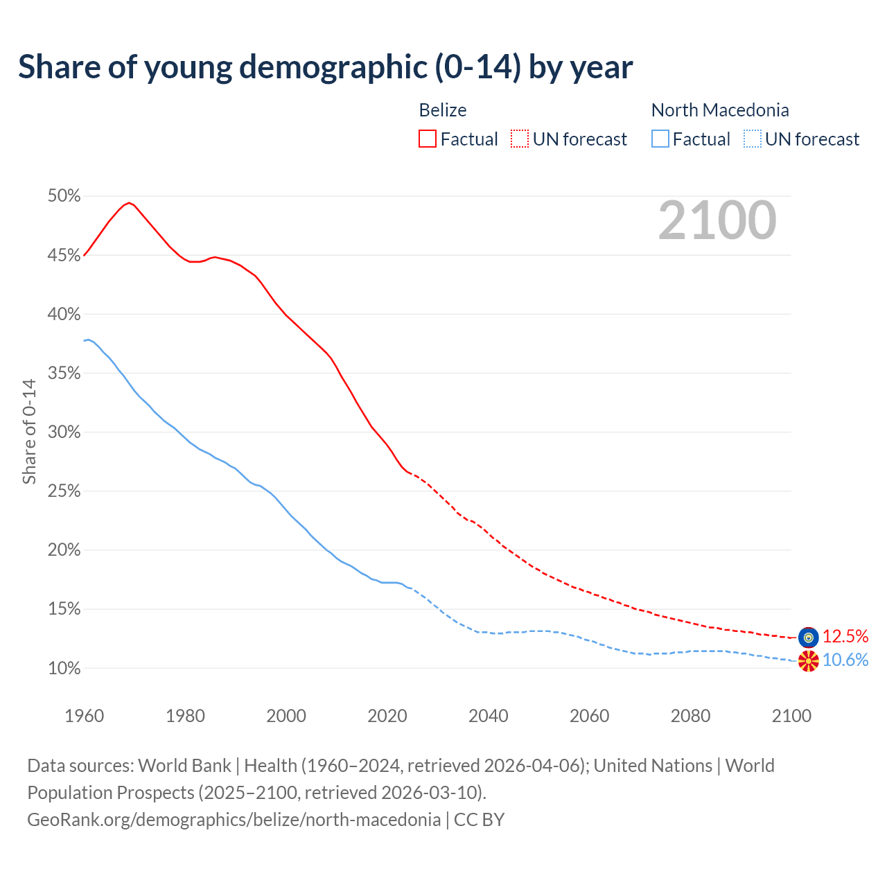 - The share of young demographic (0-15 years old) in Belize is 26.6% vs 16.8% in North Macedonia.