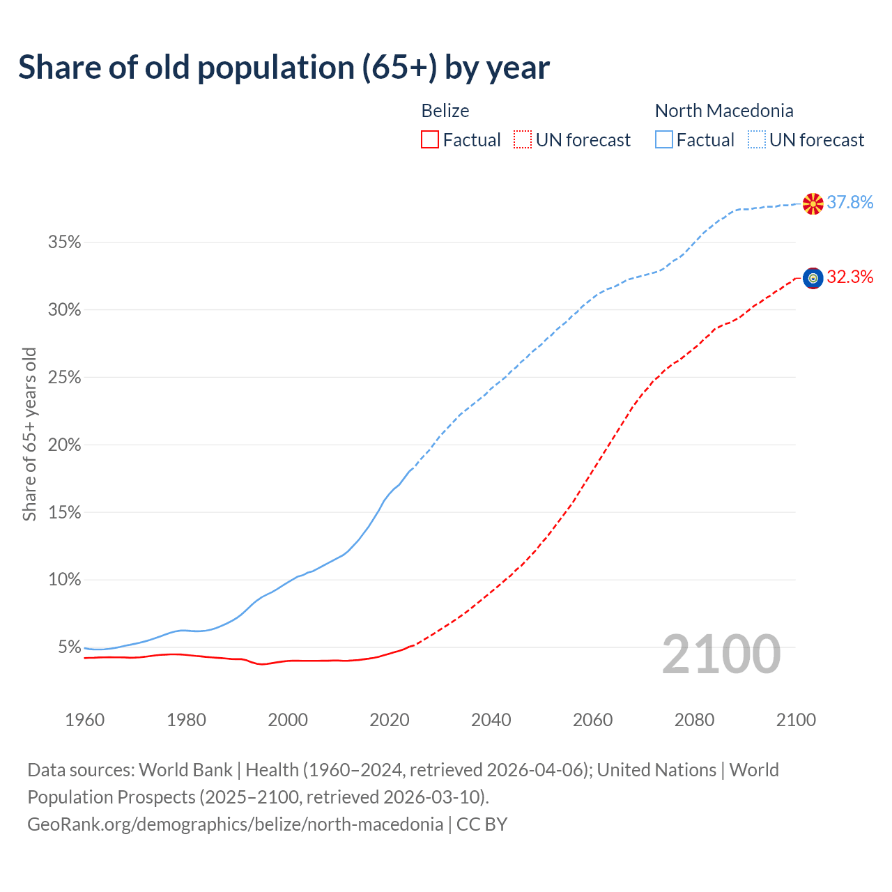The share of older people aged 65 and over is 5.02% in Belize and 18% in North Macedonia. Life expectancy in Belize compared to North Macedonia .