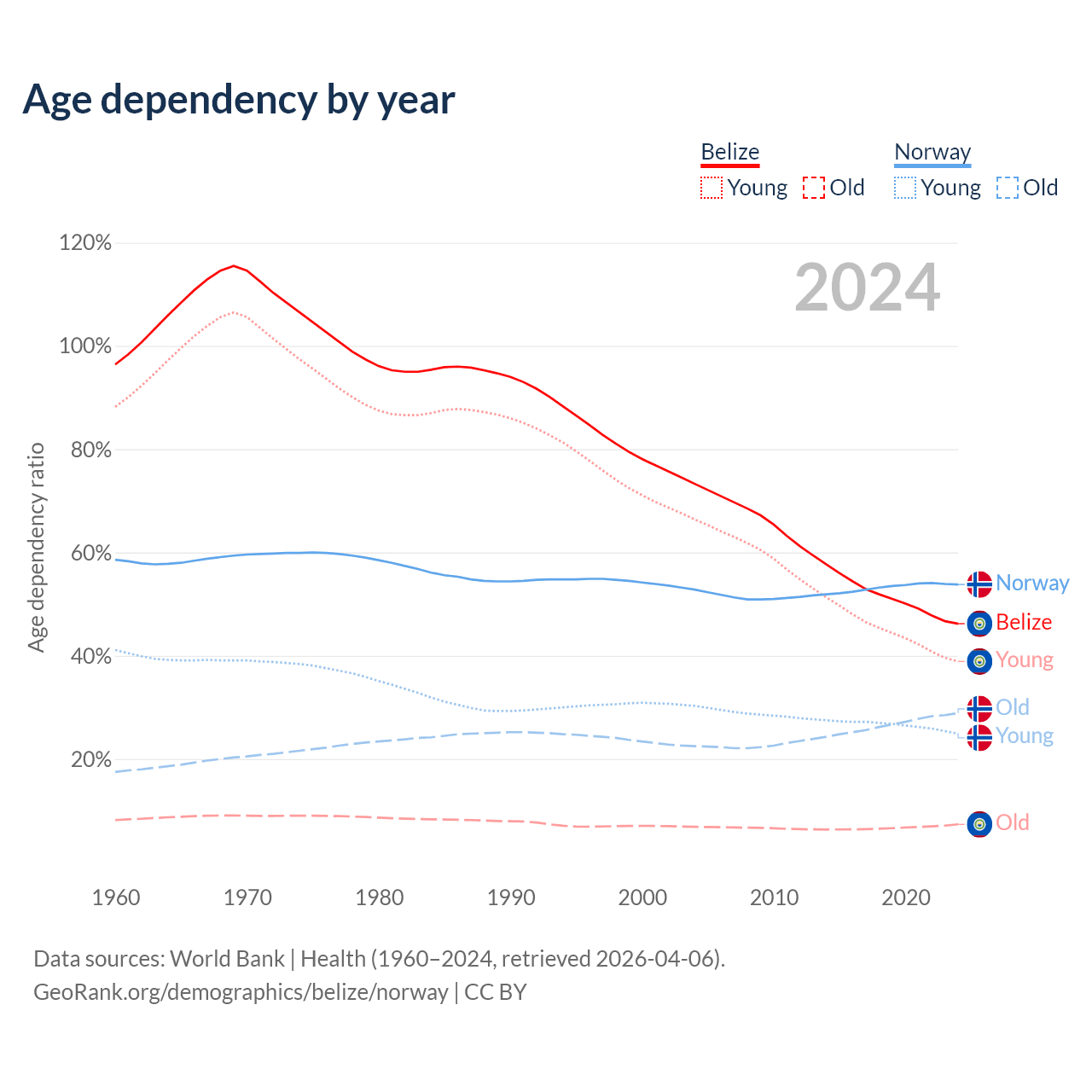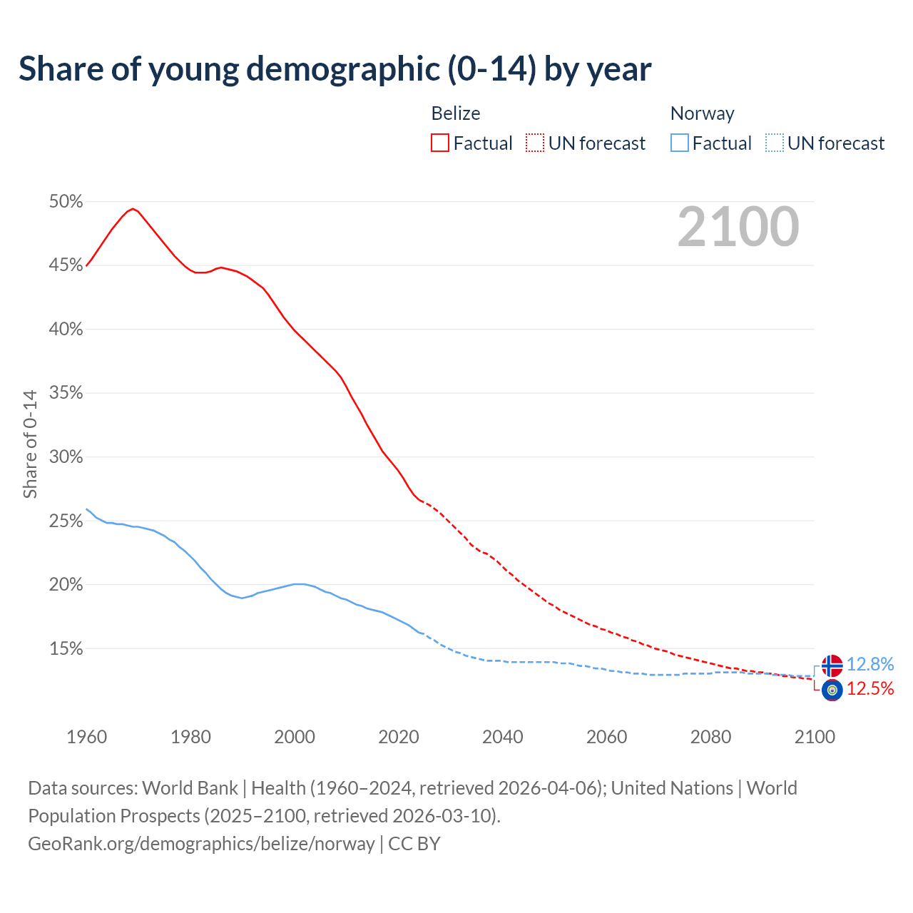 - The share of young demographic (0-15 years old) in Belize is 26.6% vs 16.2% in Norway.