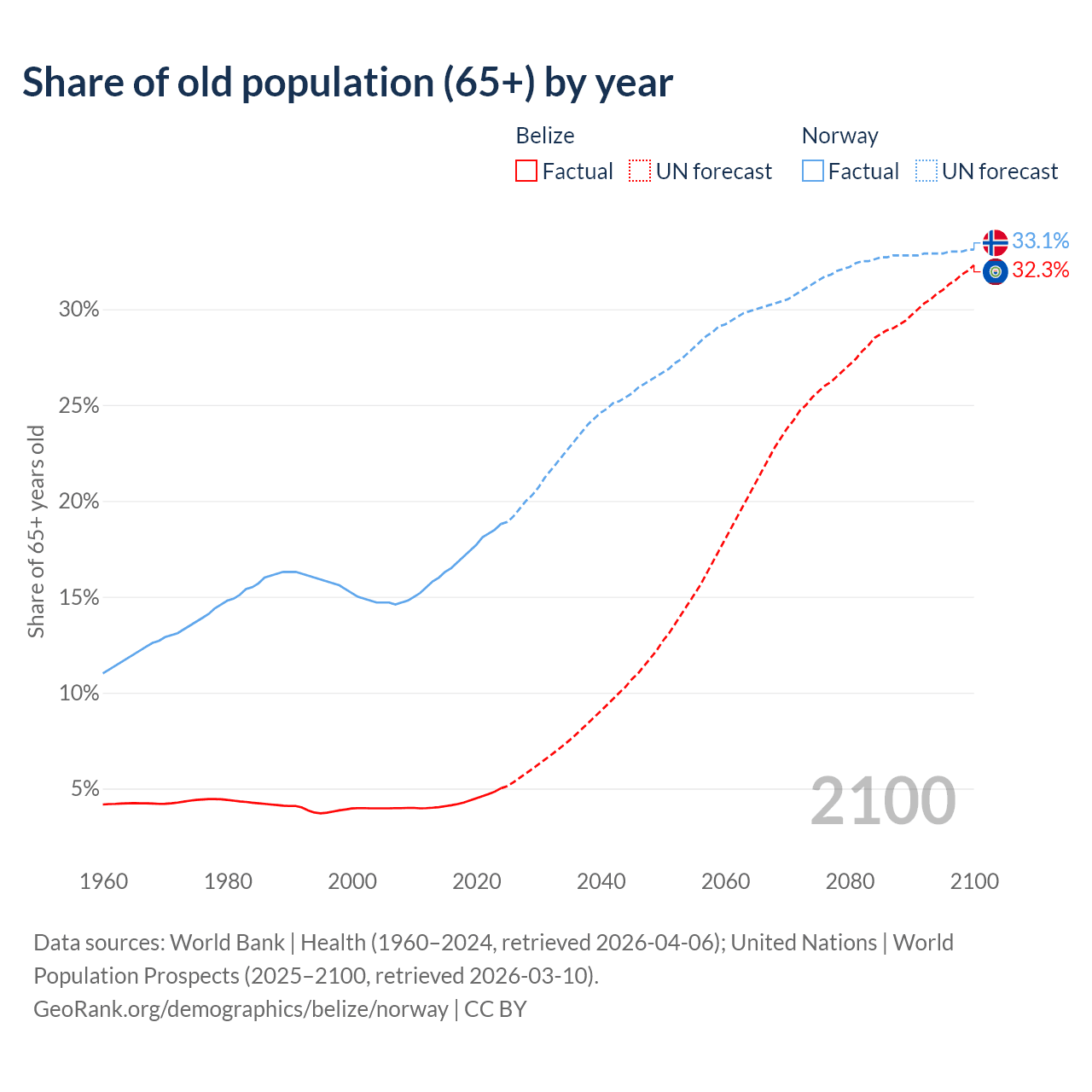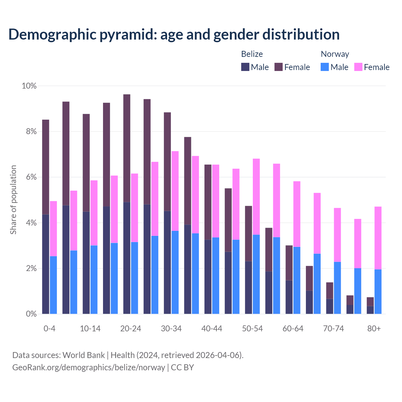 - The share of old-age demographic (65+) in Belize is 5.02% vs 18.8% in Norway.