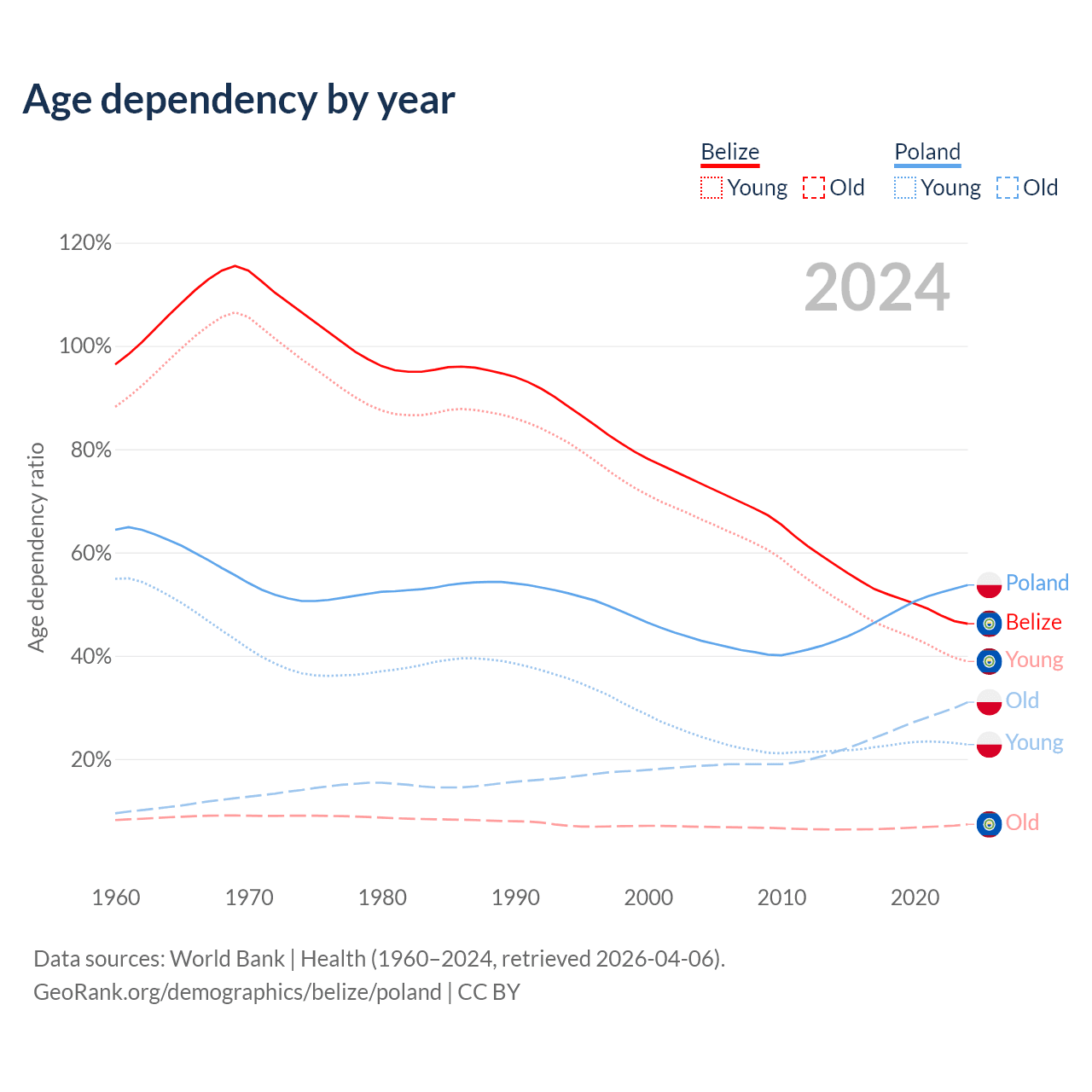 - The share of young demographic (0-15 years old) in Belize is 26.6% vs 14.8% in Poland.