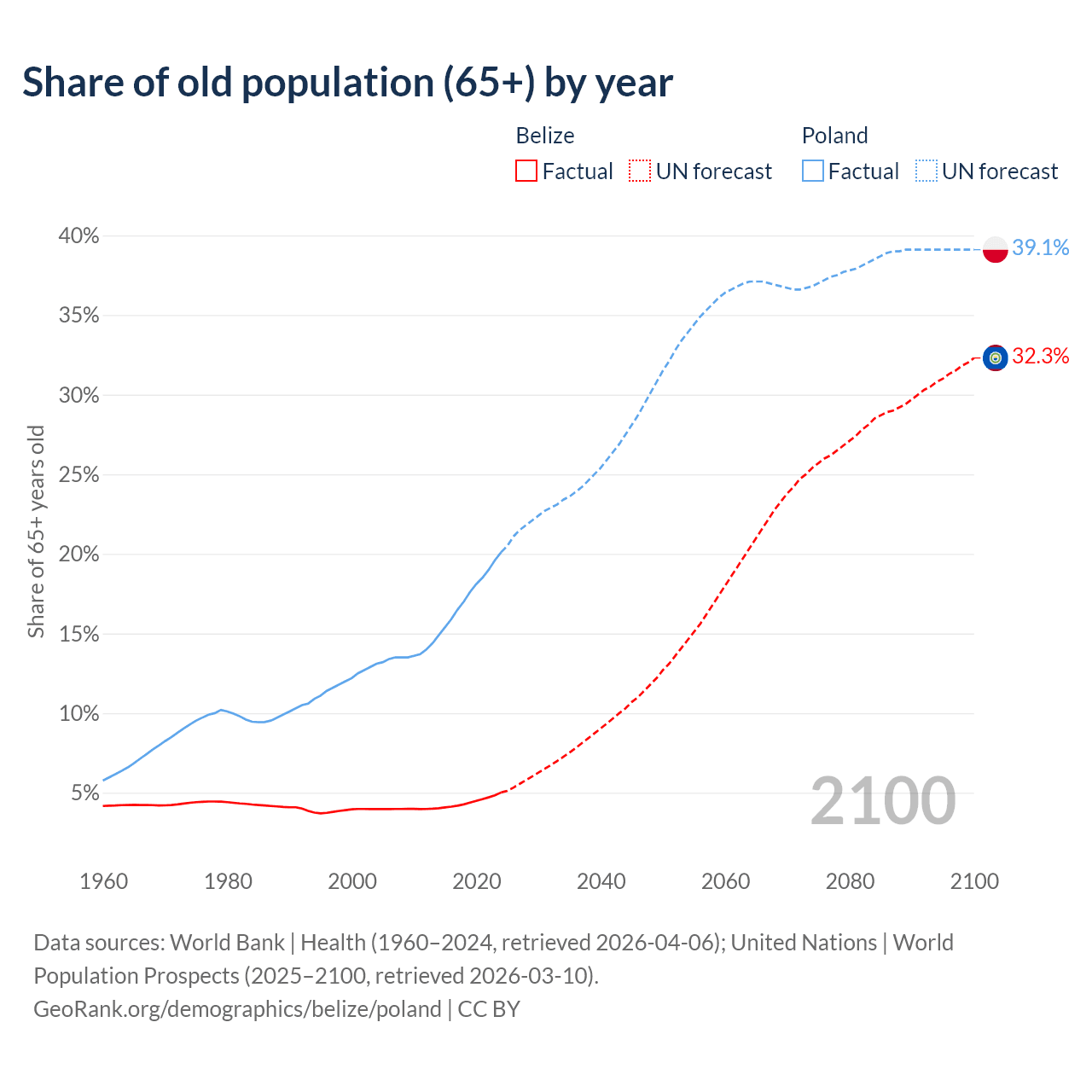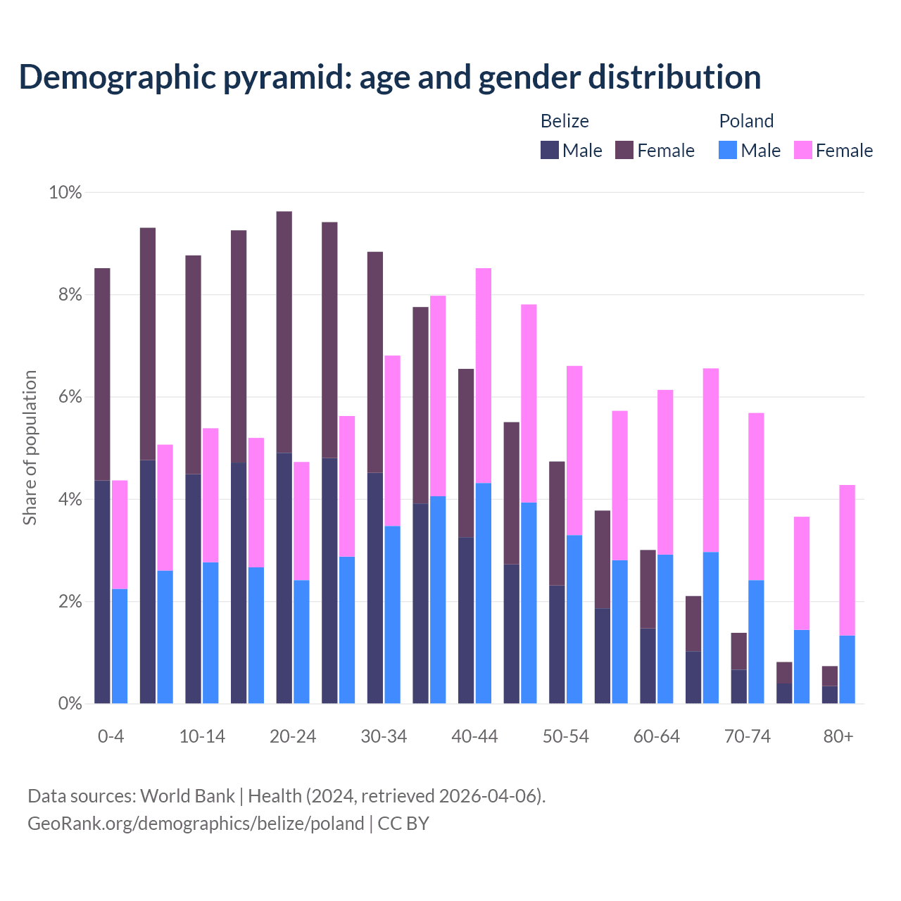 - The share of old-age demographic (65+) in Belize is 5.02% vs 20.1% in Poland.