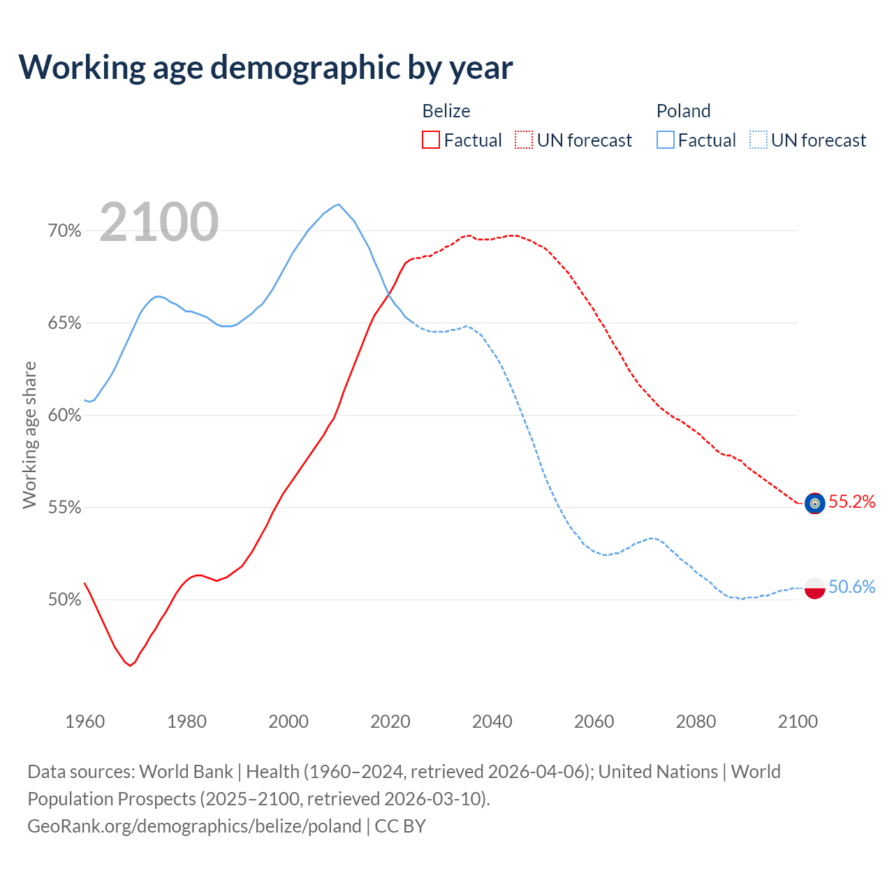 Median age Belize vs Poland, 1960-2100