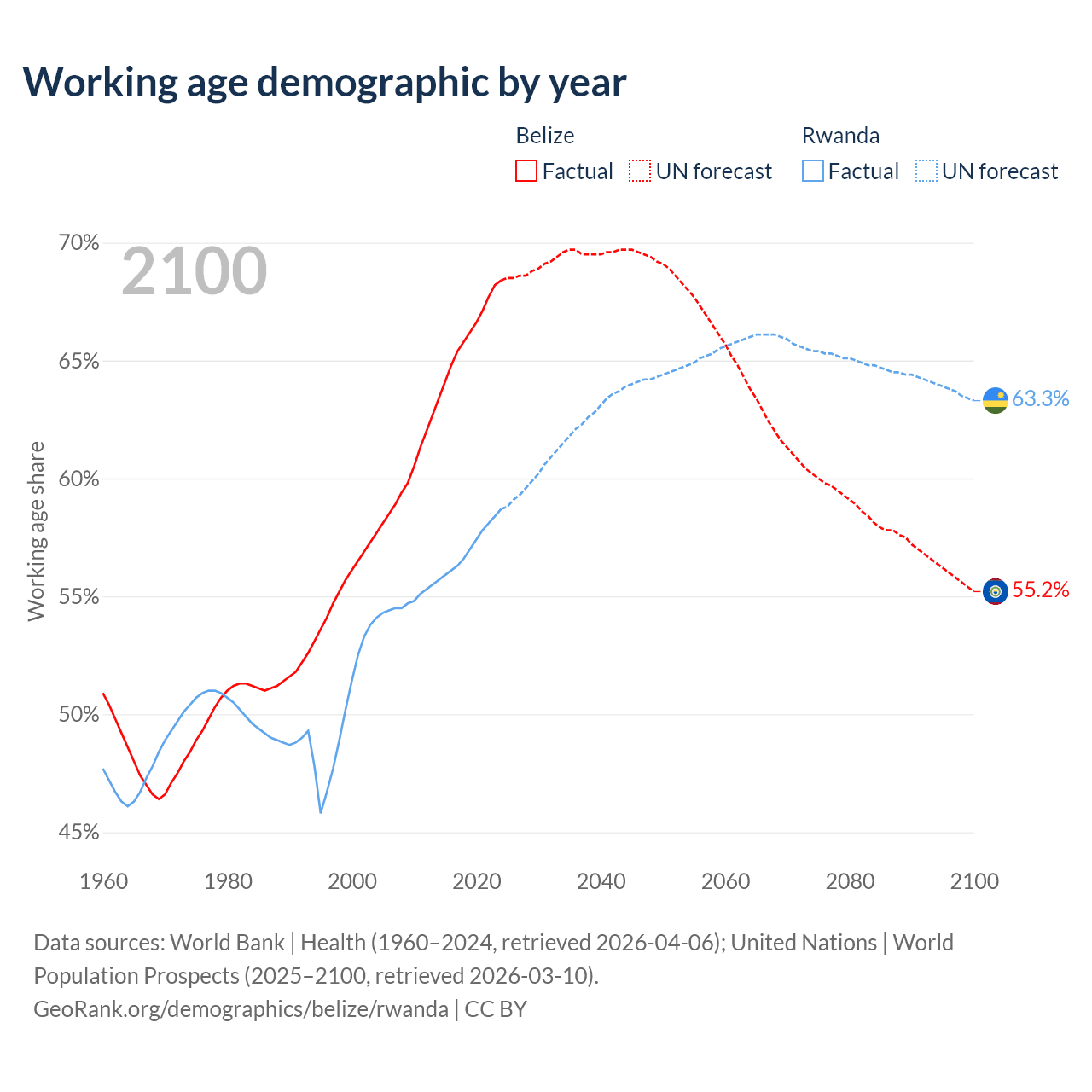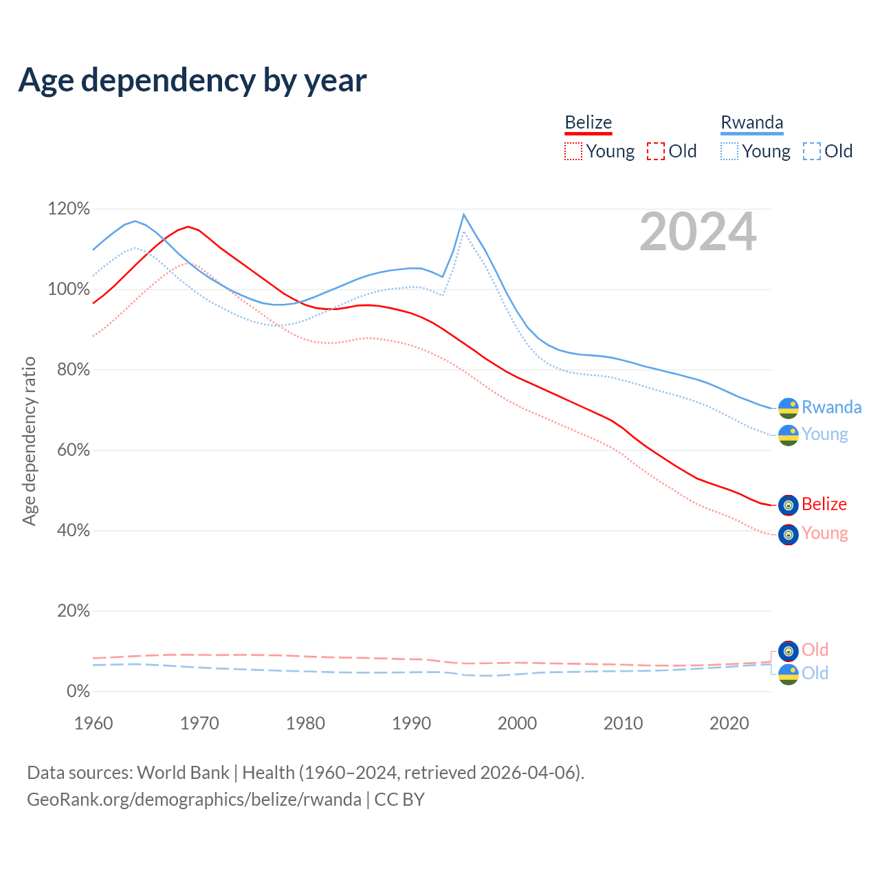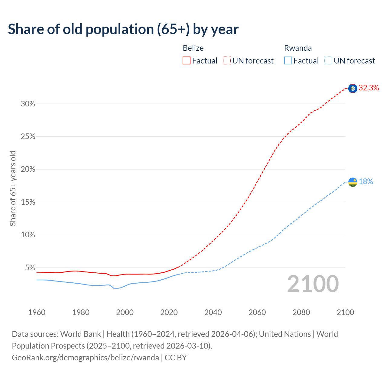 - The share of old-age demographic (65+) in Belize is 5.02% vs 3.93% in Rwanda.