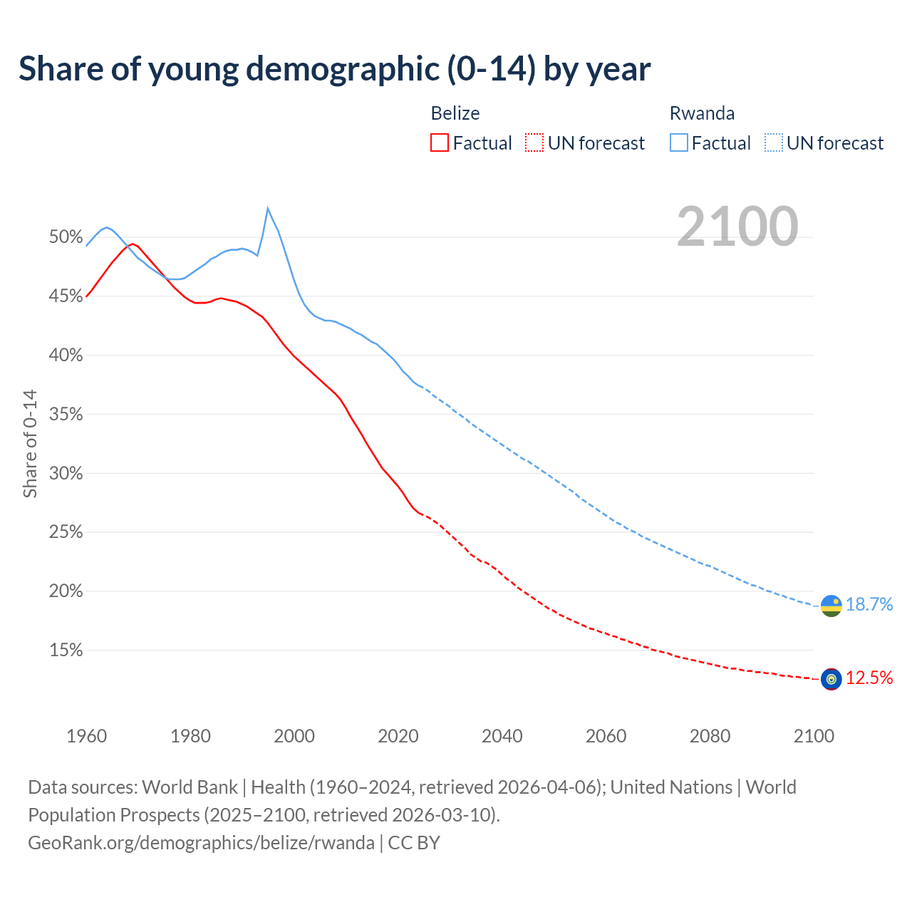 - The share of young demographic (0-15 years old) in Belize is 26.6% vs 37.4% in Rwanda.