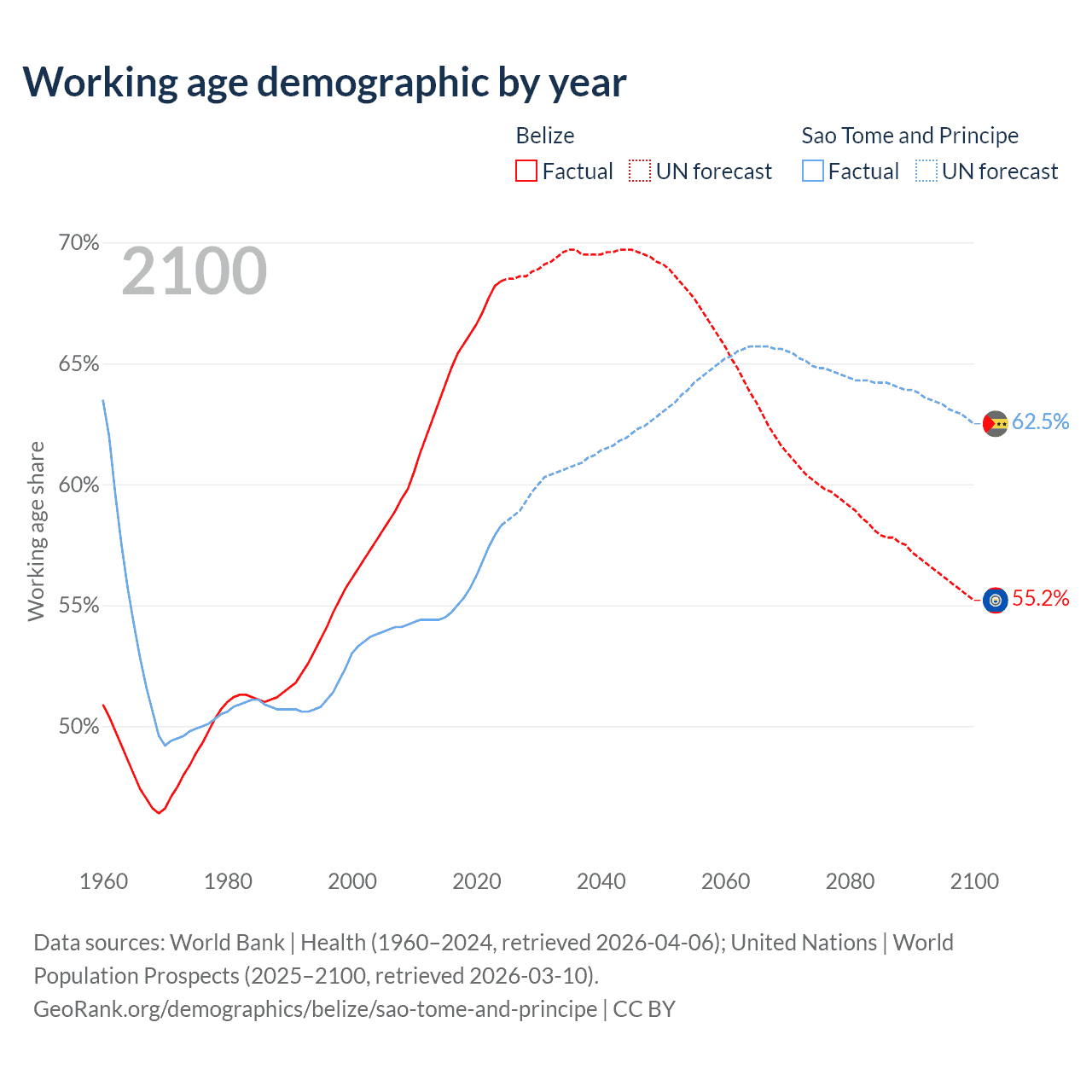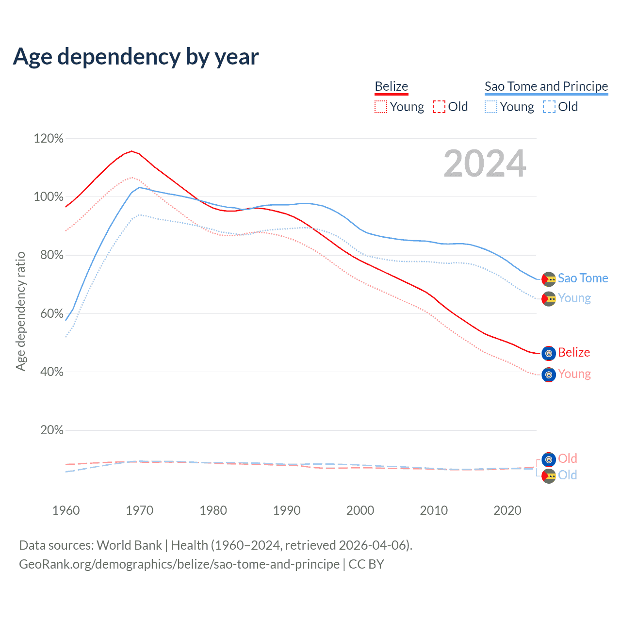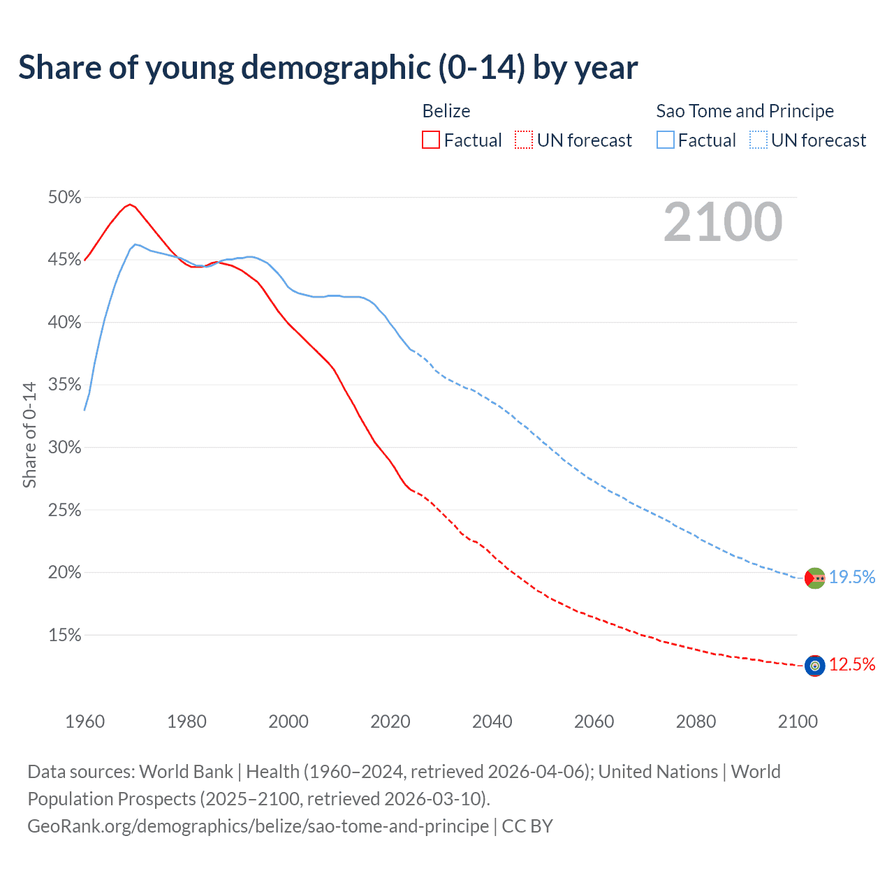 - The share of young demographic (0-15 years old) in Belize is 26.6% vs 37.8% in Sao Tome and Principe.