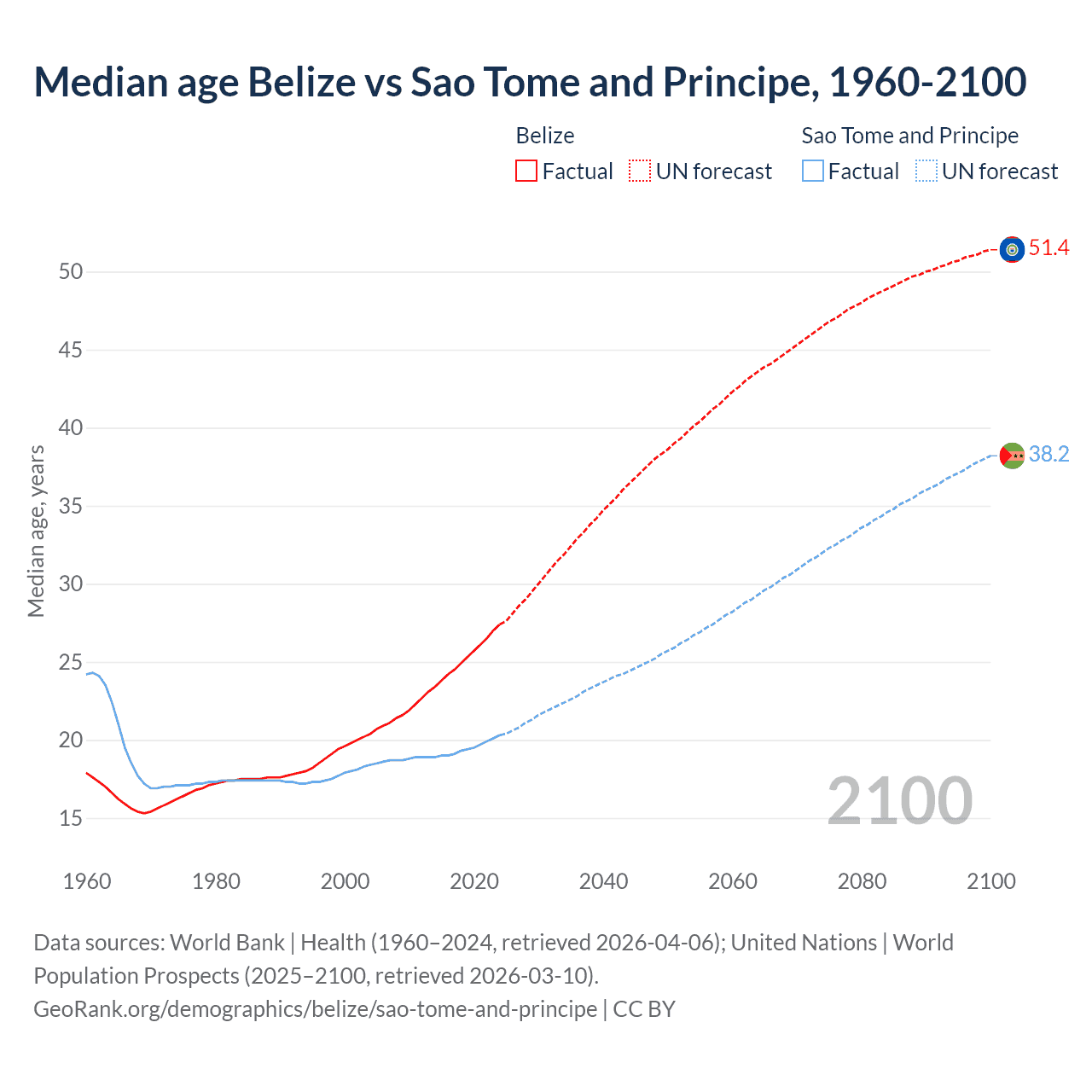 Median age Belize vs Sao Tome and Principe, 1960-2100