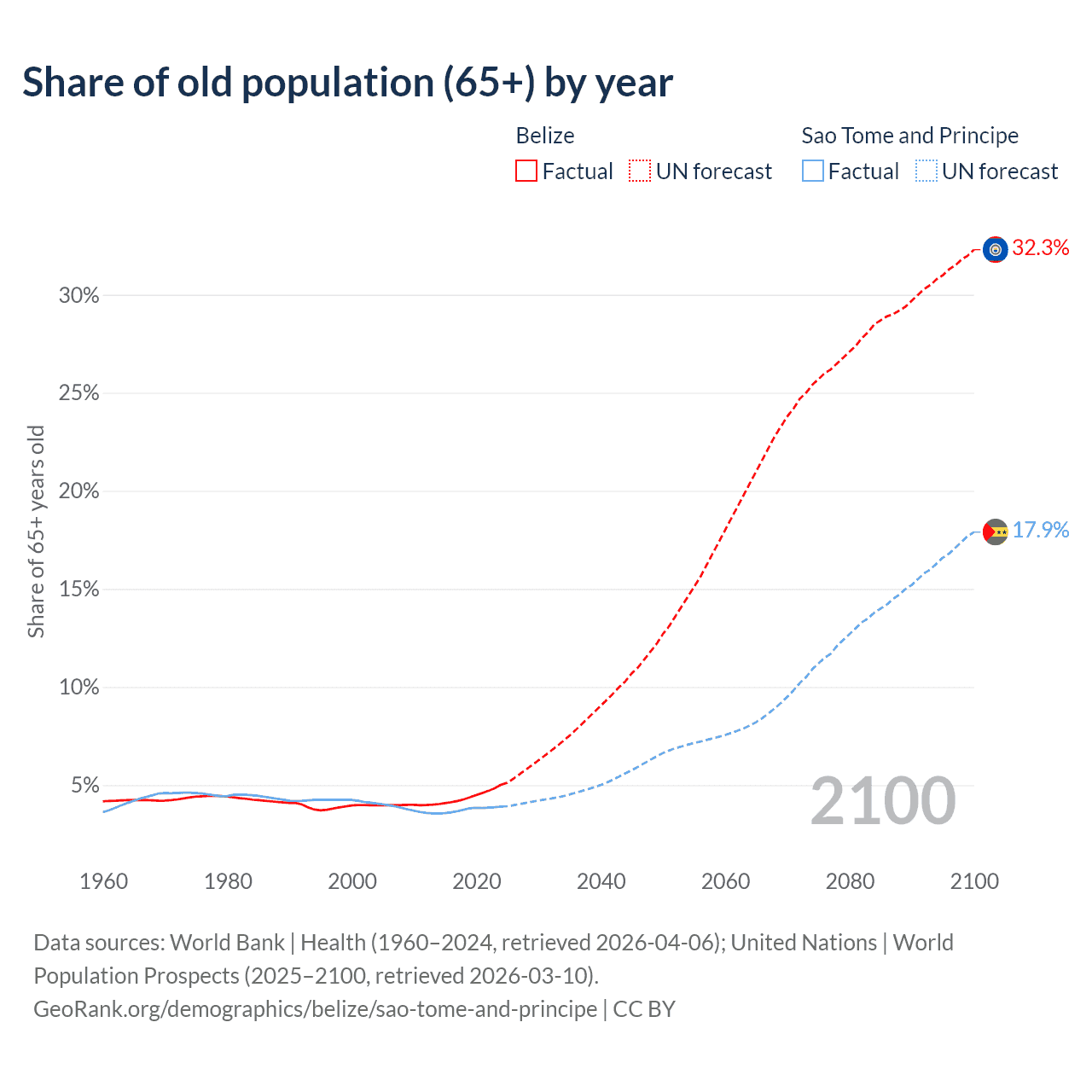 - The share of old-age demographic (65+) in Belize is 5.02% vs 3.9% in Sao Tome and Principe.