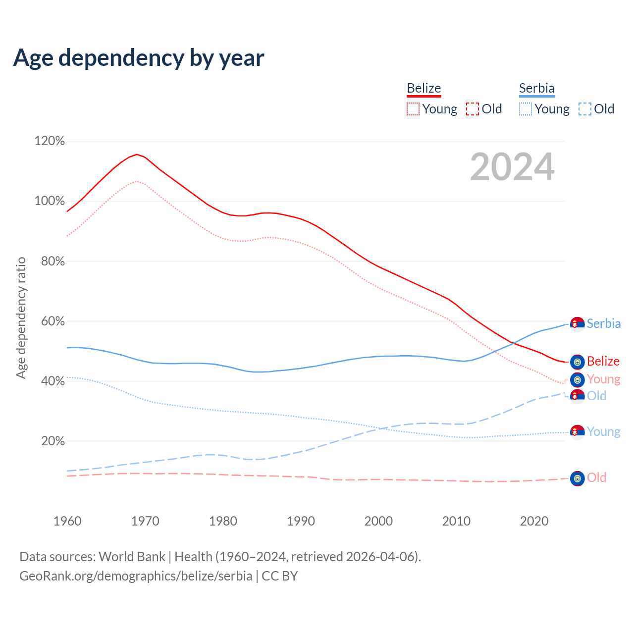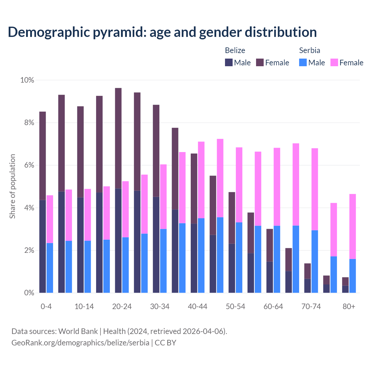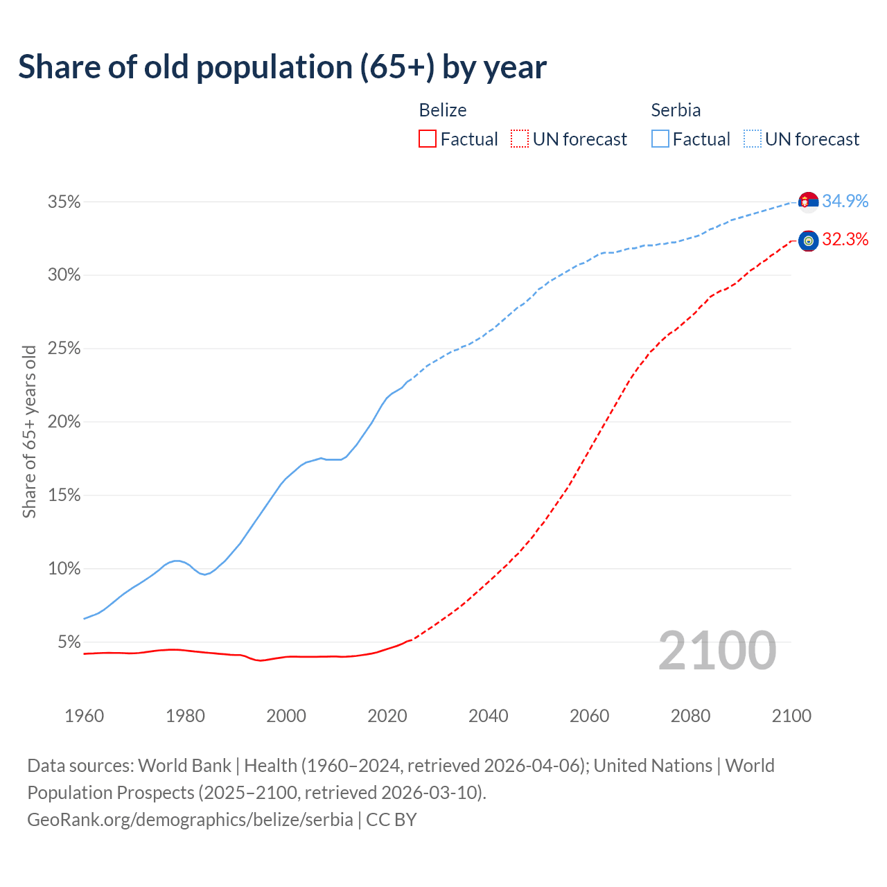 - The share of old-age demographic (65+) in Belize is 5.02% vs 22.7% in Serbia.