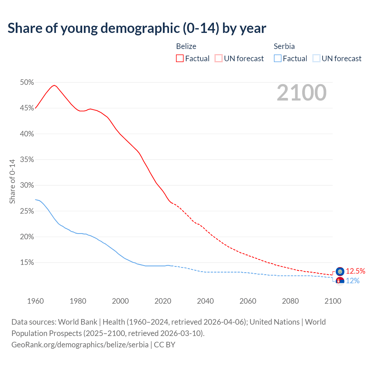 - The share of young demographic (0-15 years old) in Belize is 26.6% vs 14.3% in Serbia.