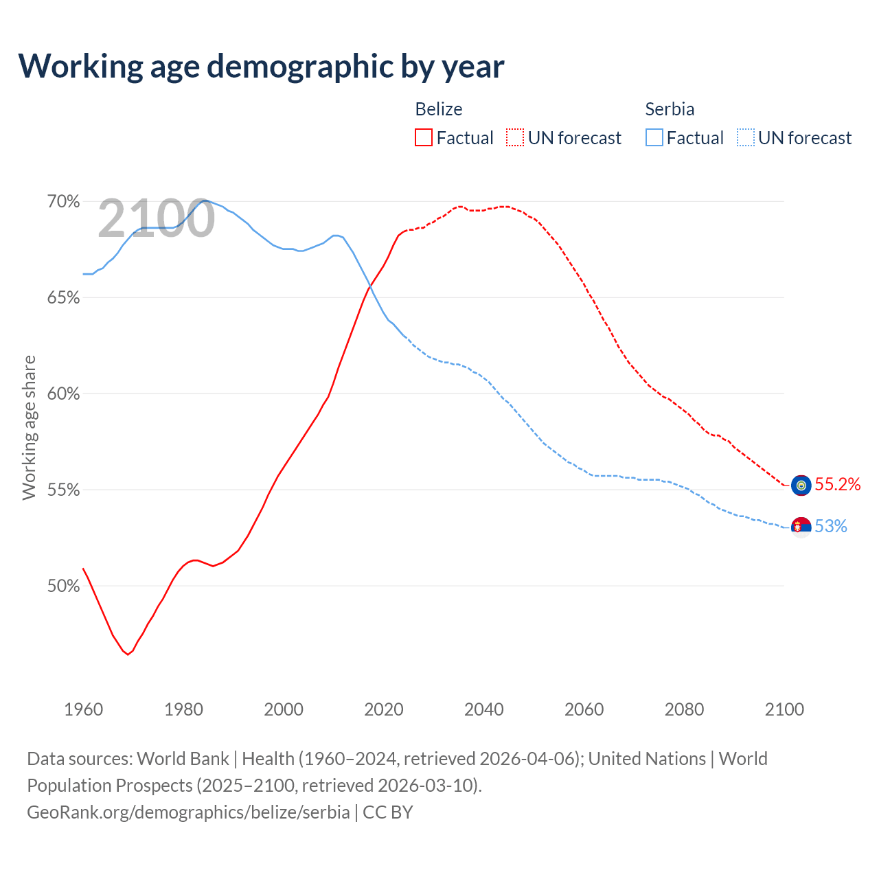 - Belize has 294K working age adults (aged 15-64) vs 4.09M in Serbia.