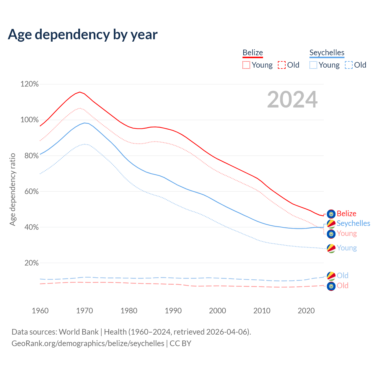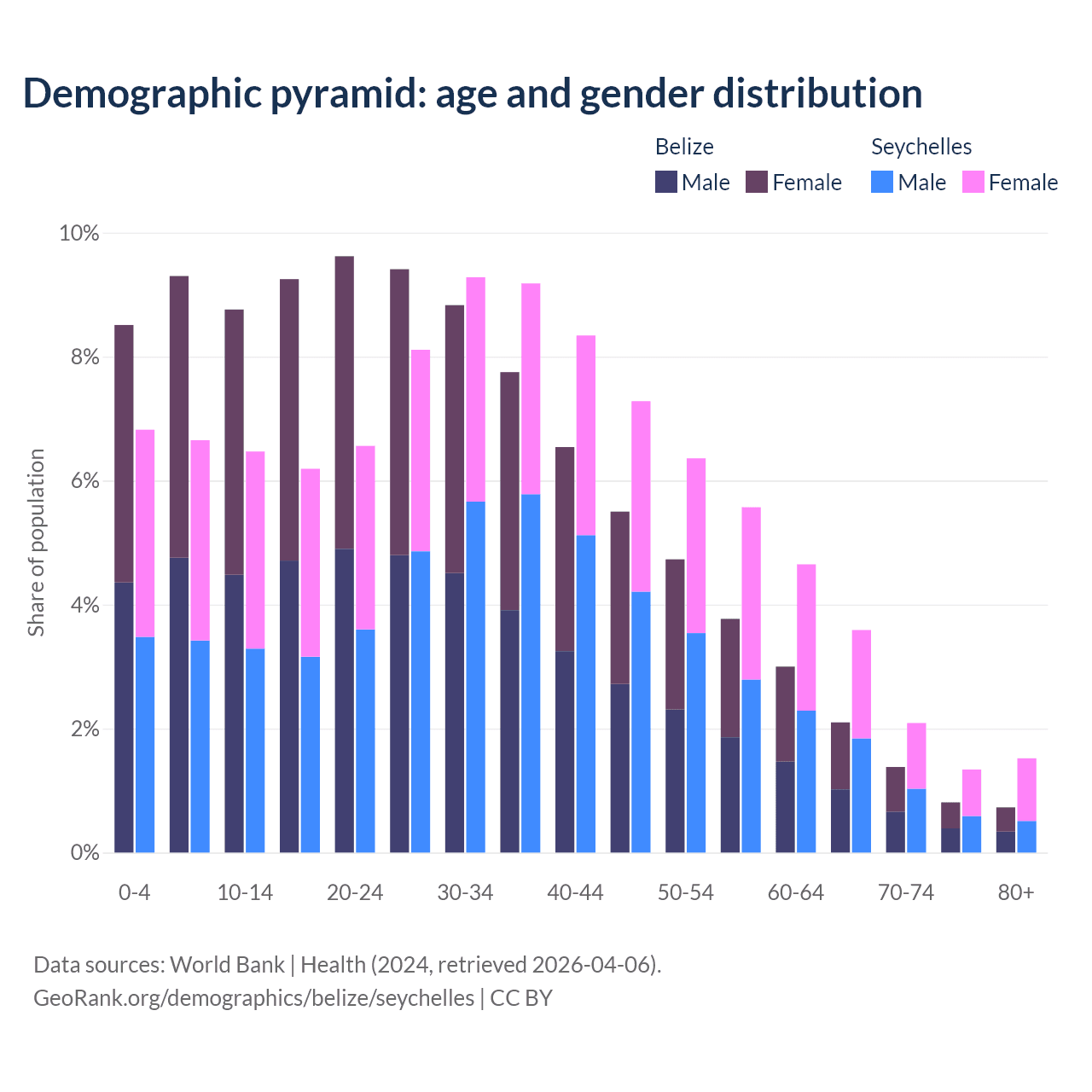 - The share of old-age demographic (65+) in Belize is 5.02% vs 8.54% in the Seychelles.