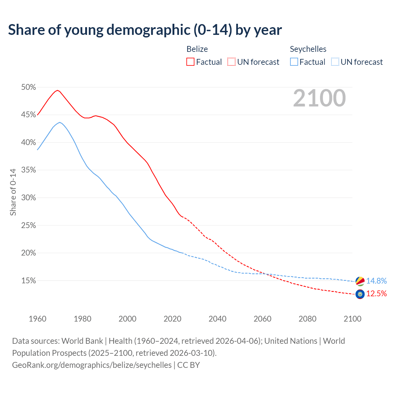 - The share of young demographic (0-15 years old) in Belize is 26.6% vs 20% in the Seychelles.