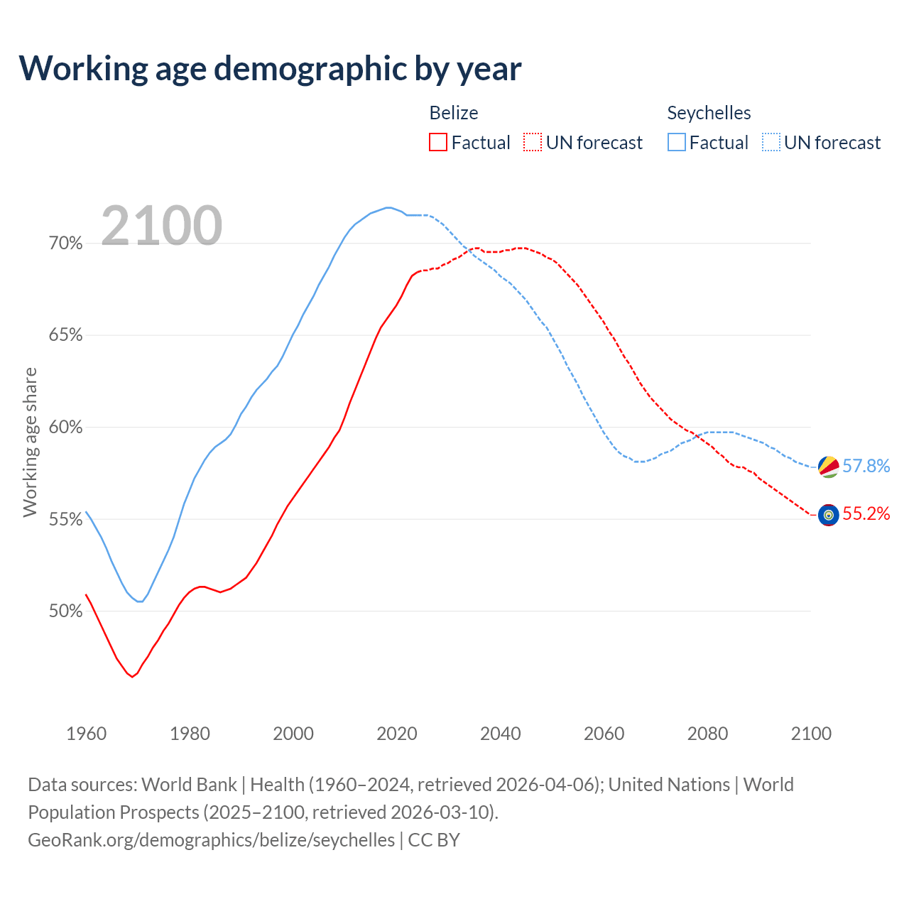 - Belize has 294K working age adults (aged 15-64) vs 90.3K in the Seychelles.