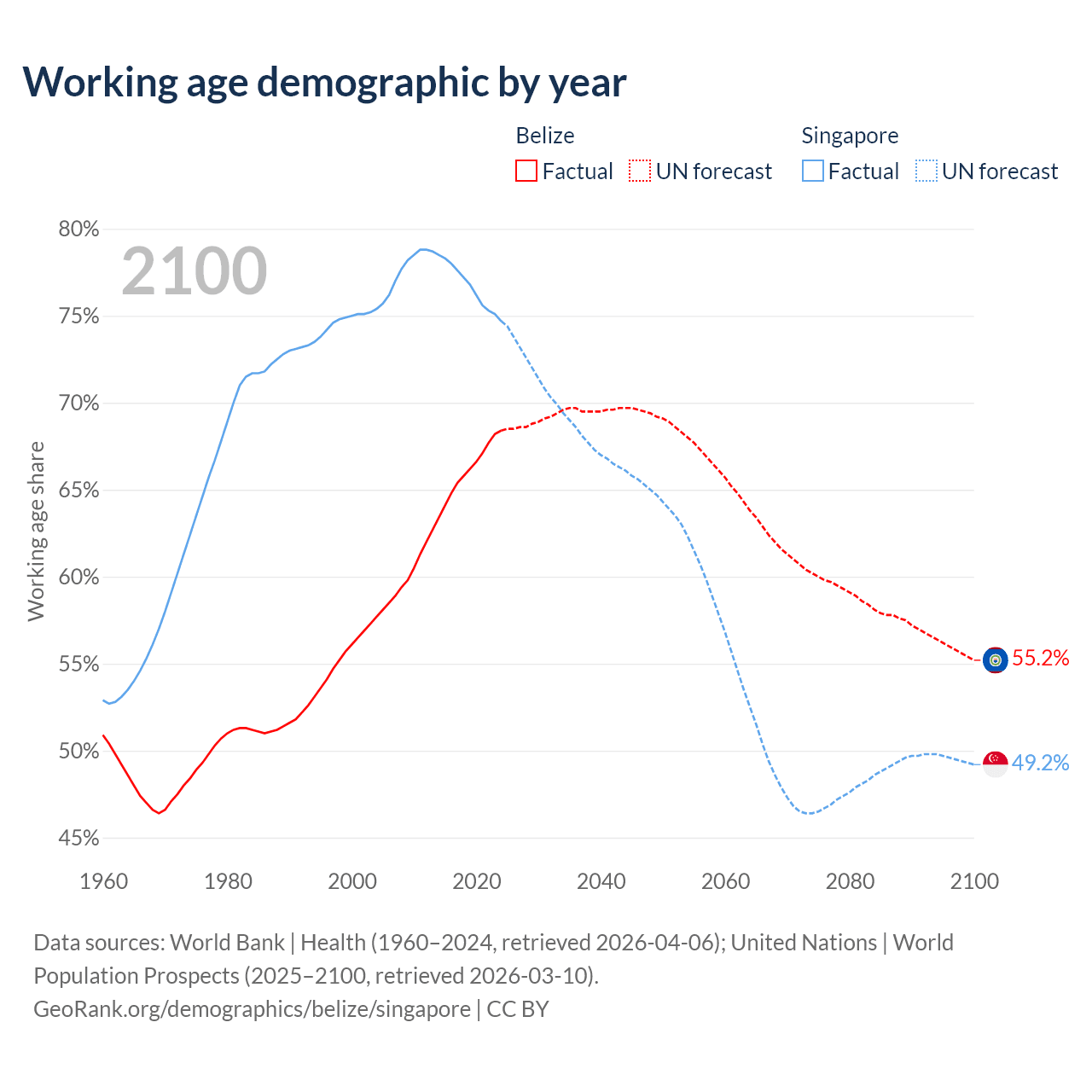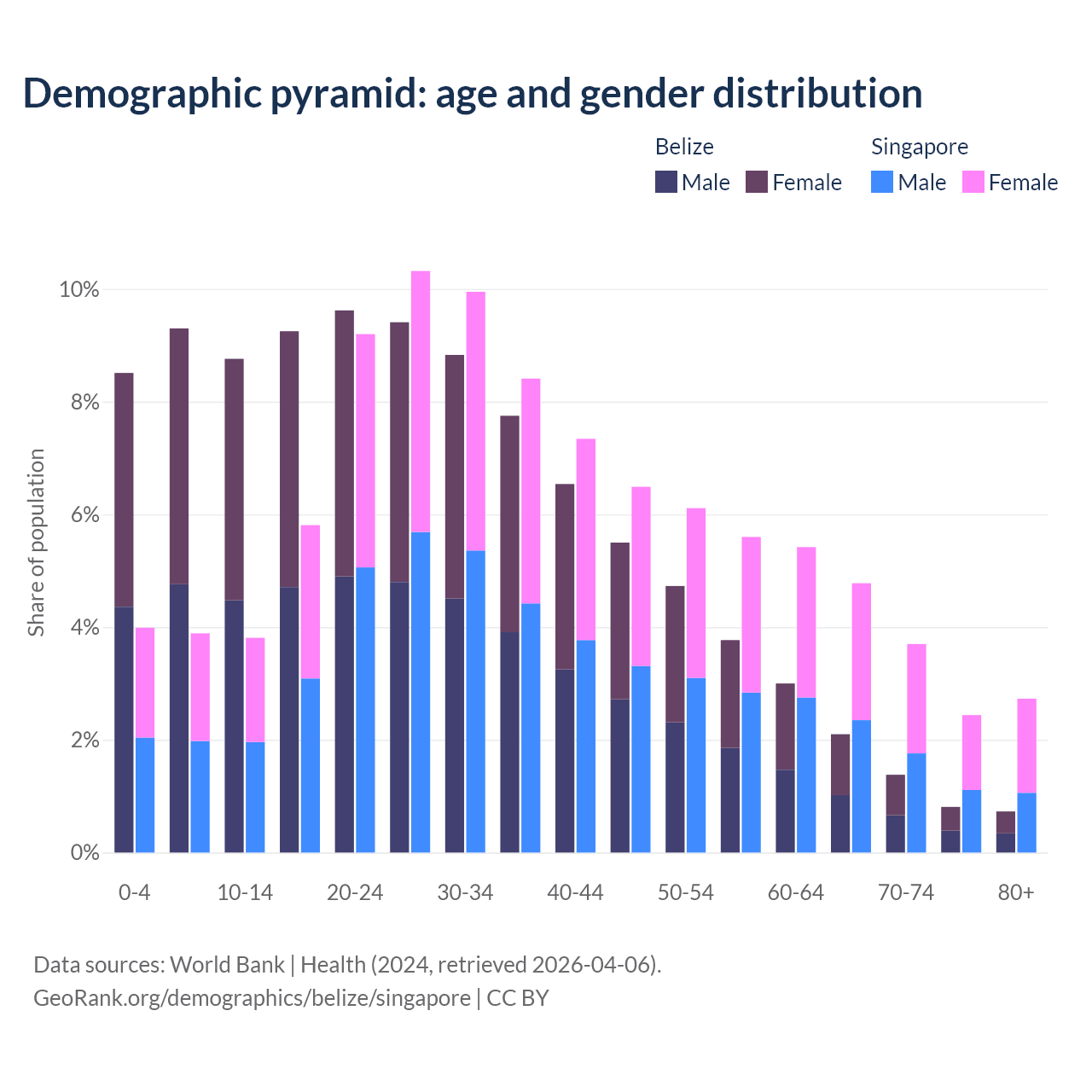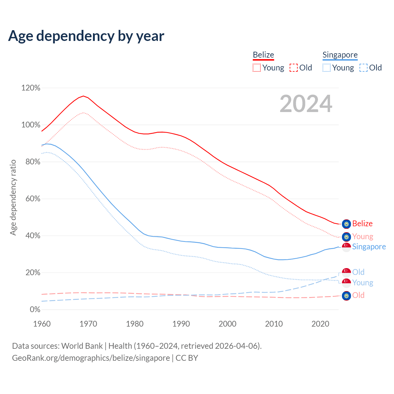 The share of older people aged 65 and over is 5.02% in Belize and 13.7% in Singapore. Life expectancy in Belize compared to Singapore .