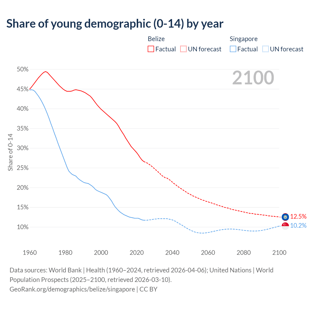 - The share of young demographic (0-15 years old) in Belize is 26.6% vs 11.7% in Singapore.
