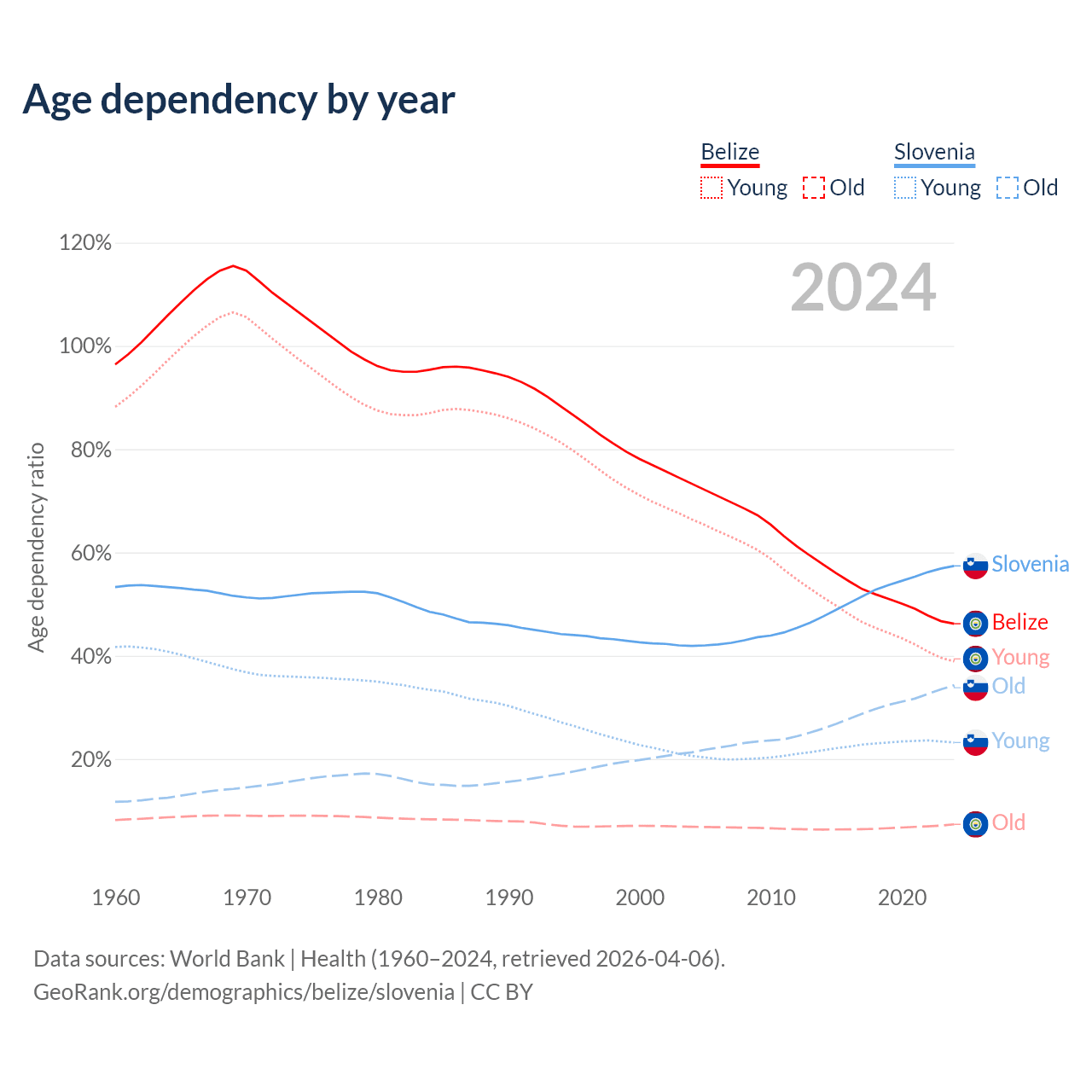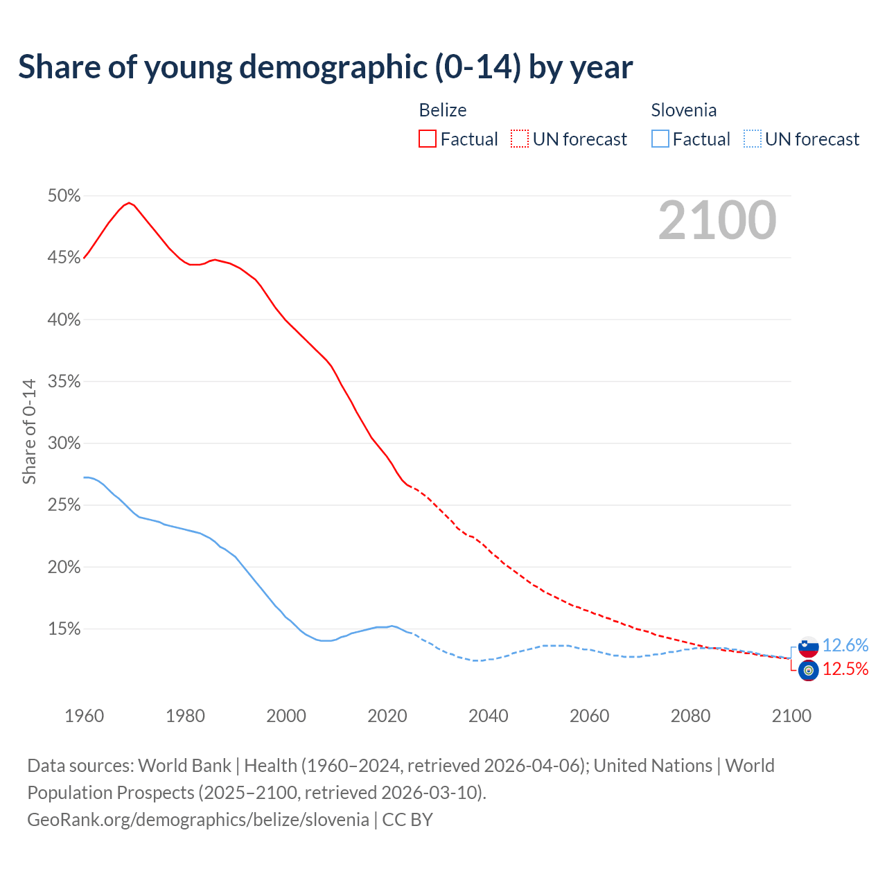 - The share of young demographic (0-15 years old) in Belize is 26.6% vs 14.7% in Slovenia.