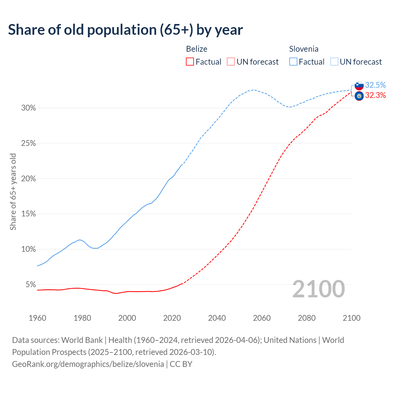 - The share of old-age demographic (65+) in Belize is 5.02% vs 21.8% in Slovenia.