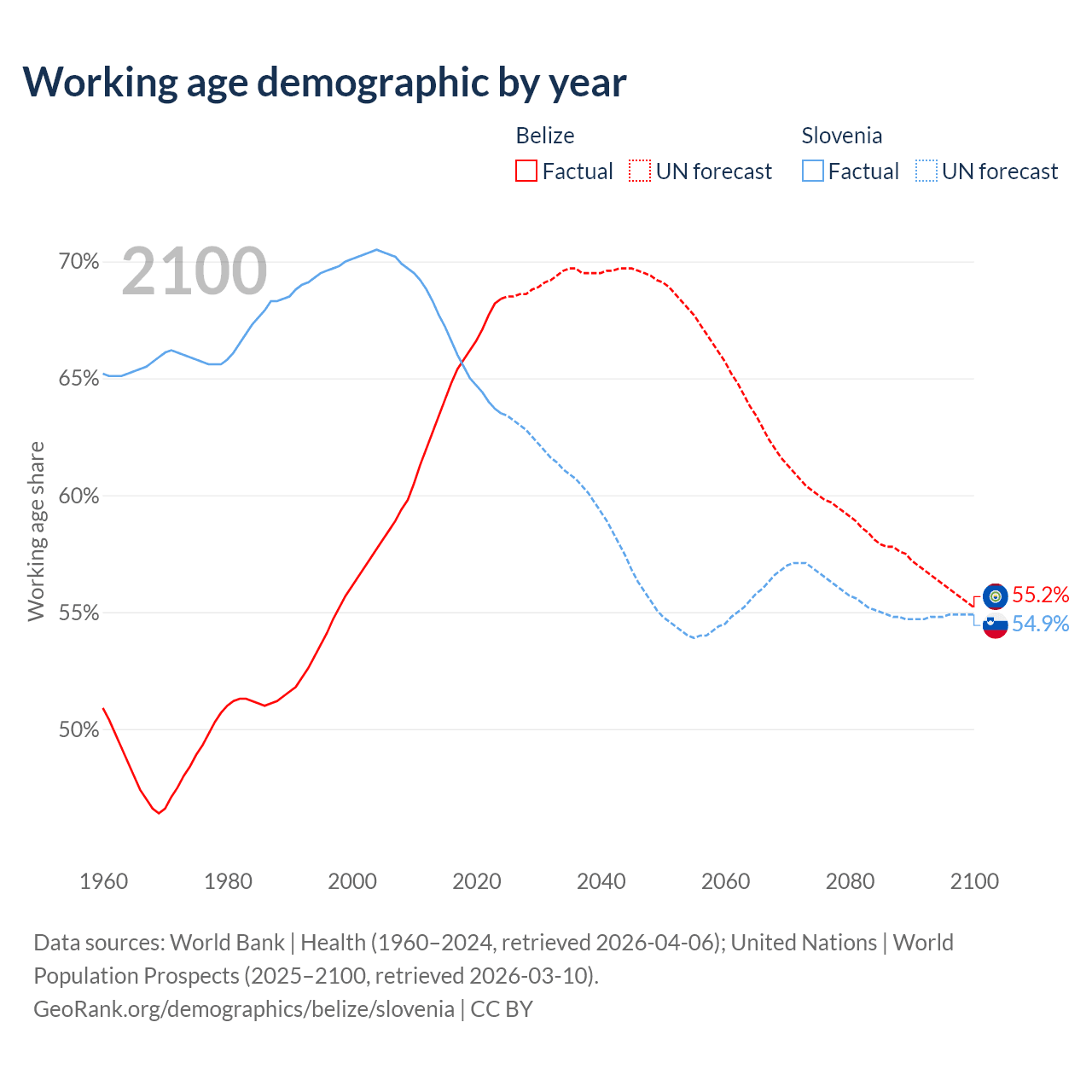 Median age Belize vs Slovenia, 1960-2100