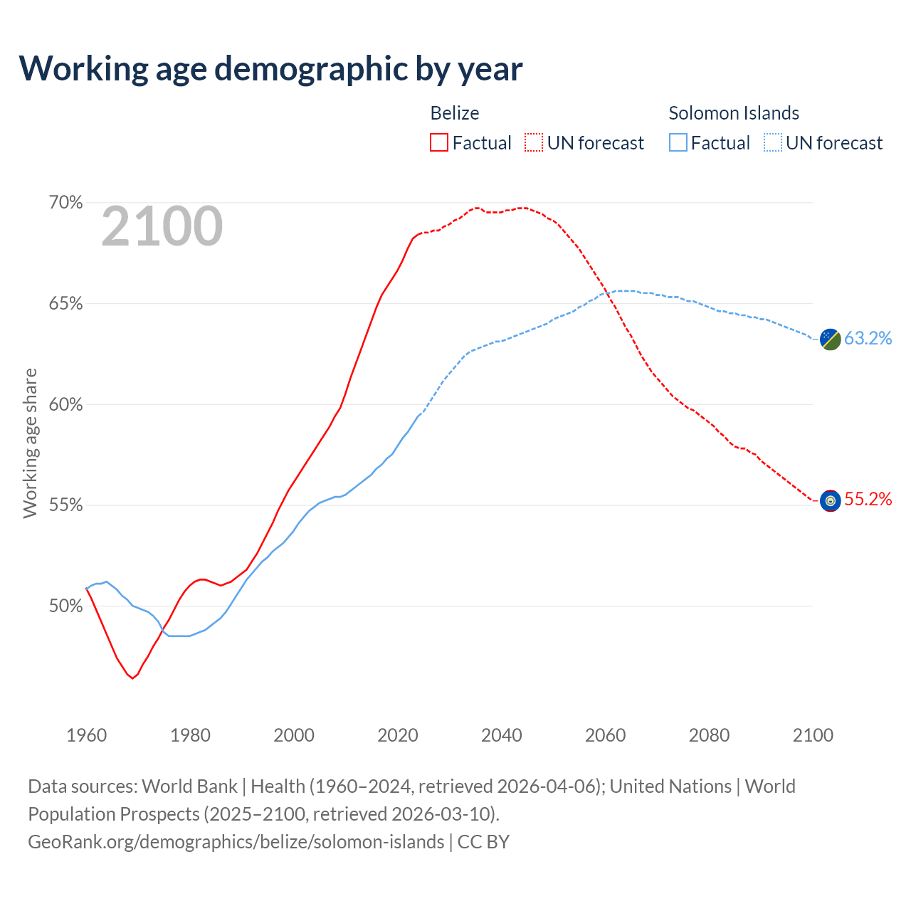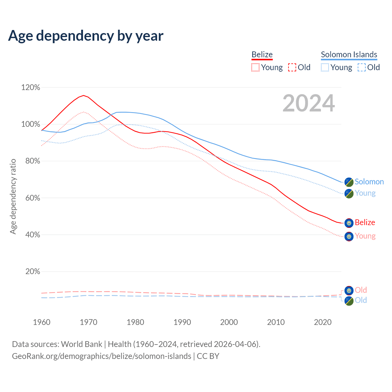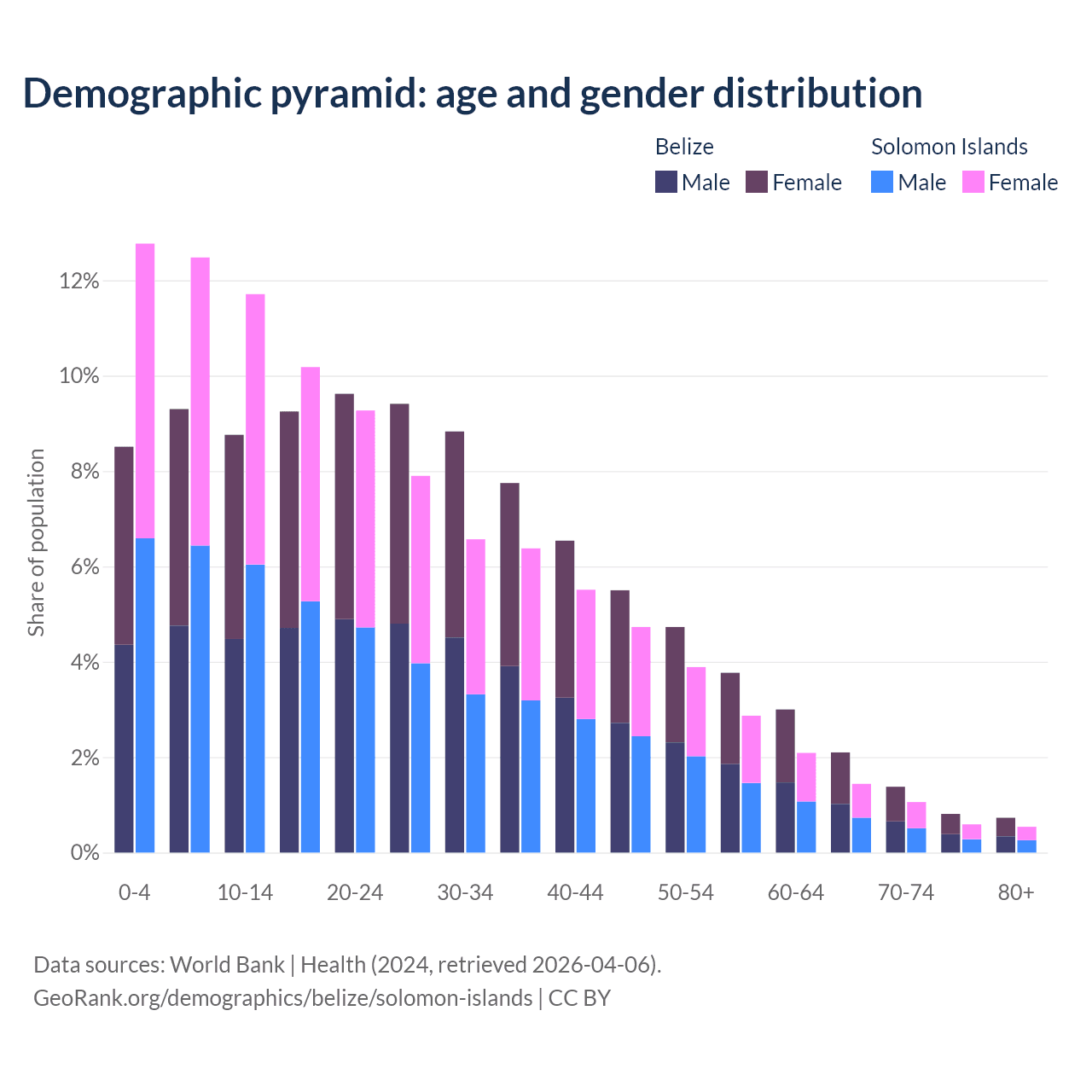 - The share of old-age demographic (65+) in Belize is 5.02% vs 3.64% in the Solomon Islands.