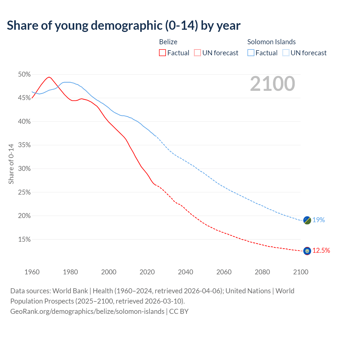 - The share of young demographic (0-15 years old) in Belize is 26.6% vs 37% in the Solomon Islands.