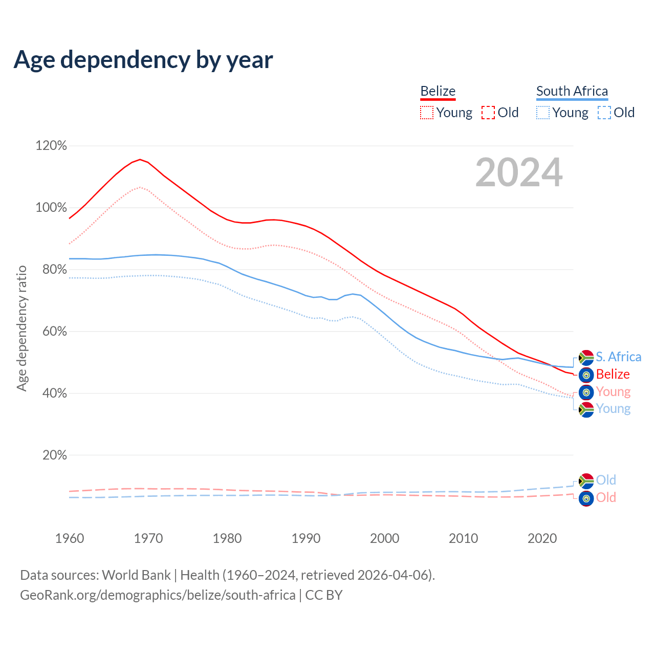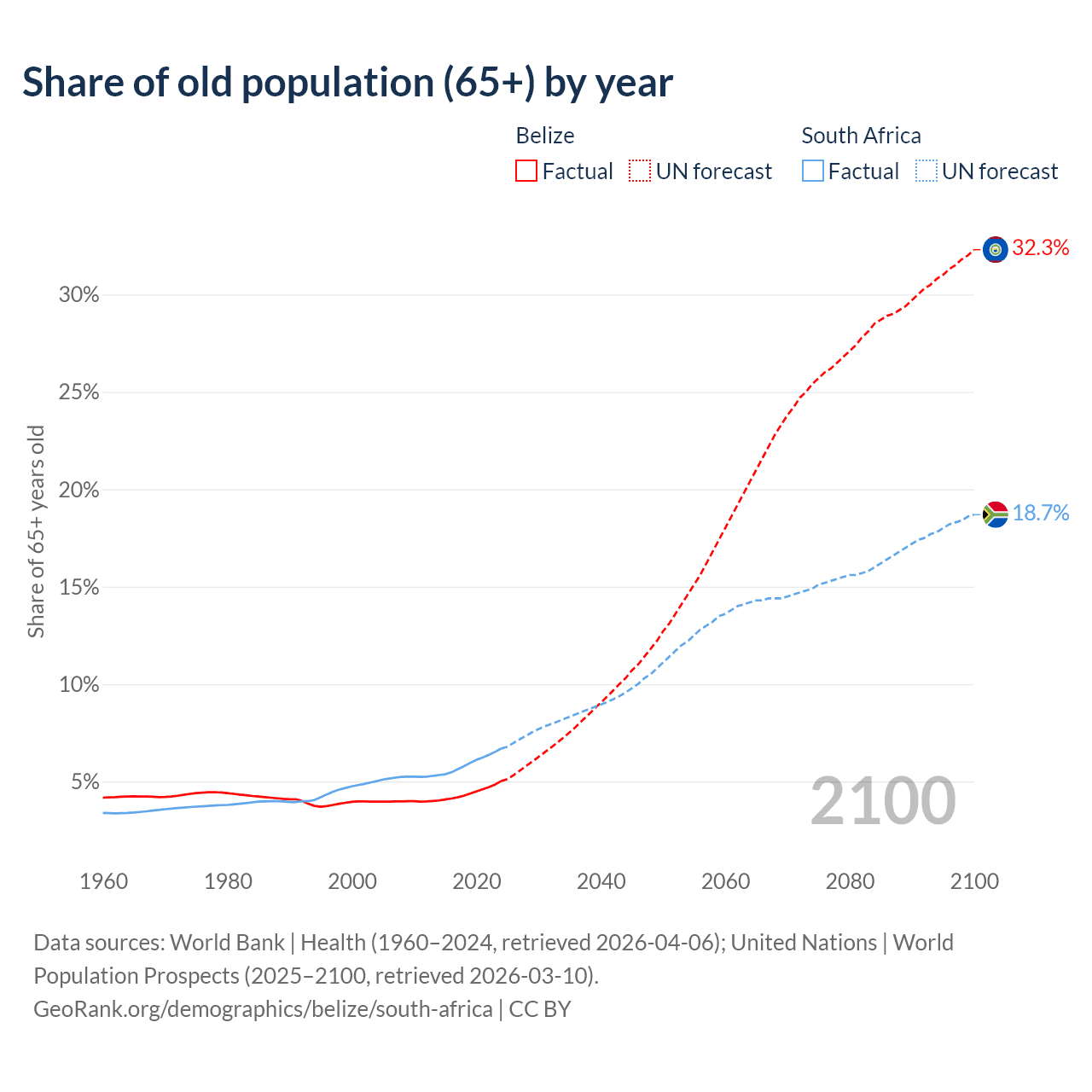 The share of older people aged 65 and over is 5.02% in Belize and 6.69% in South Africa. Life expectancy in Belize compared to South Africa .