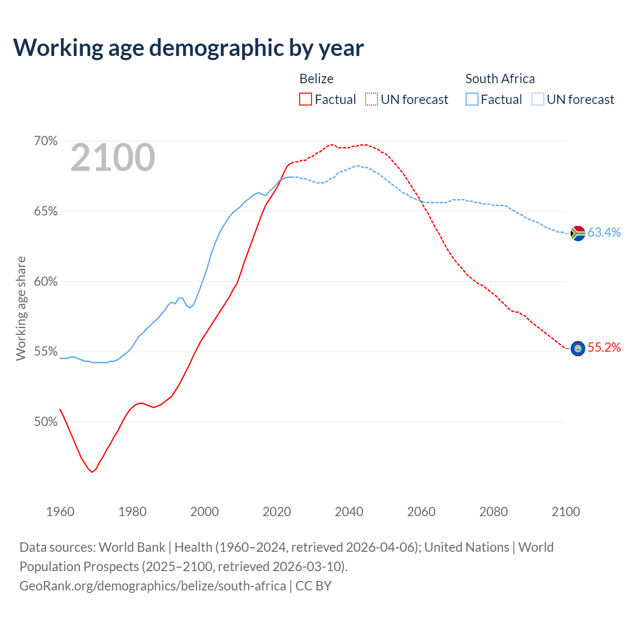 Median age Belize vs South Africa, 1960-2100