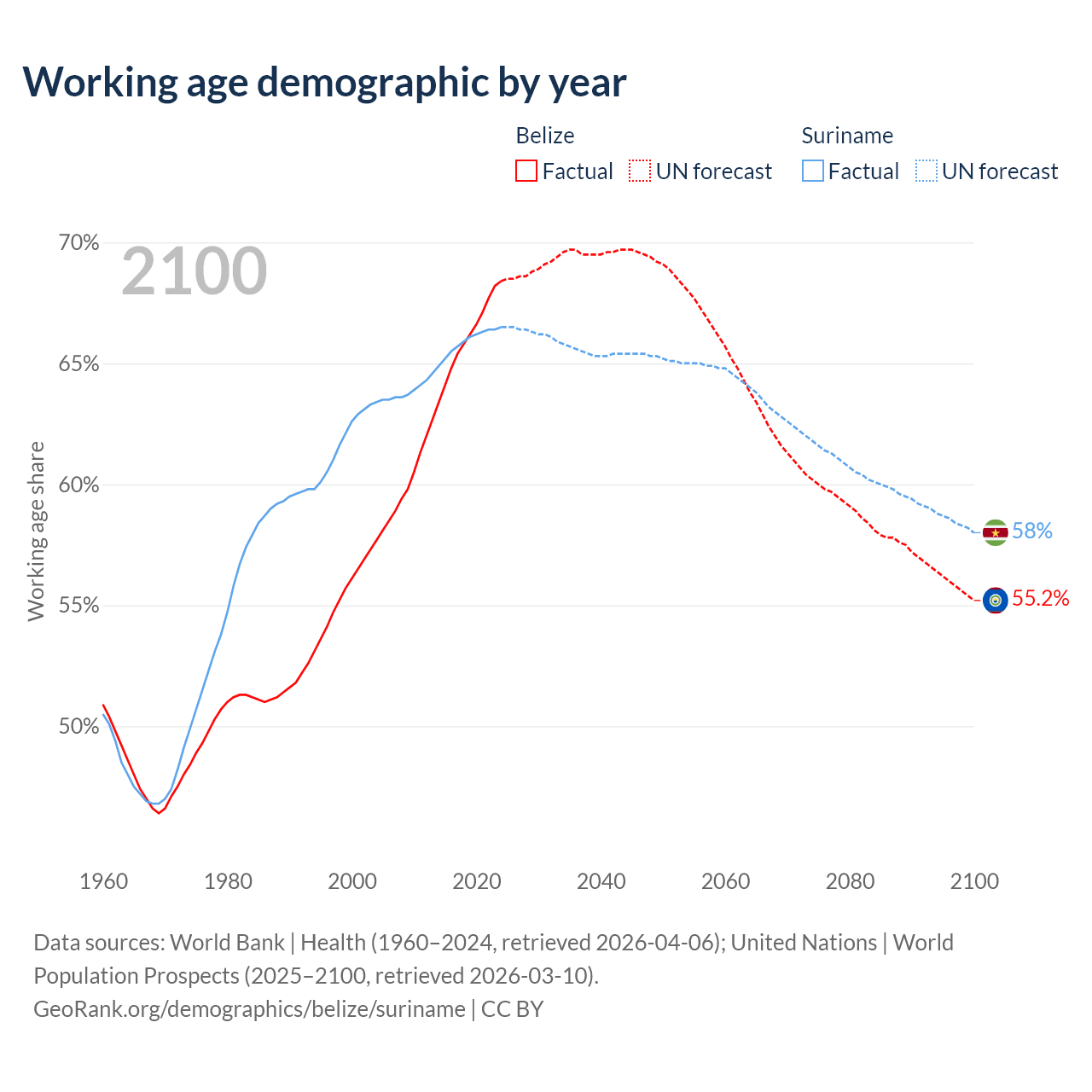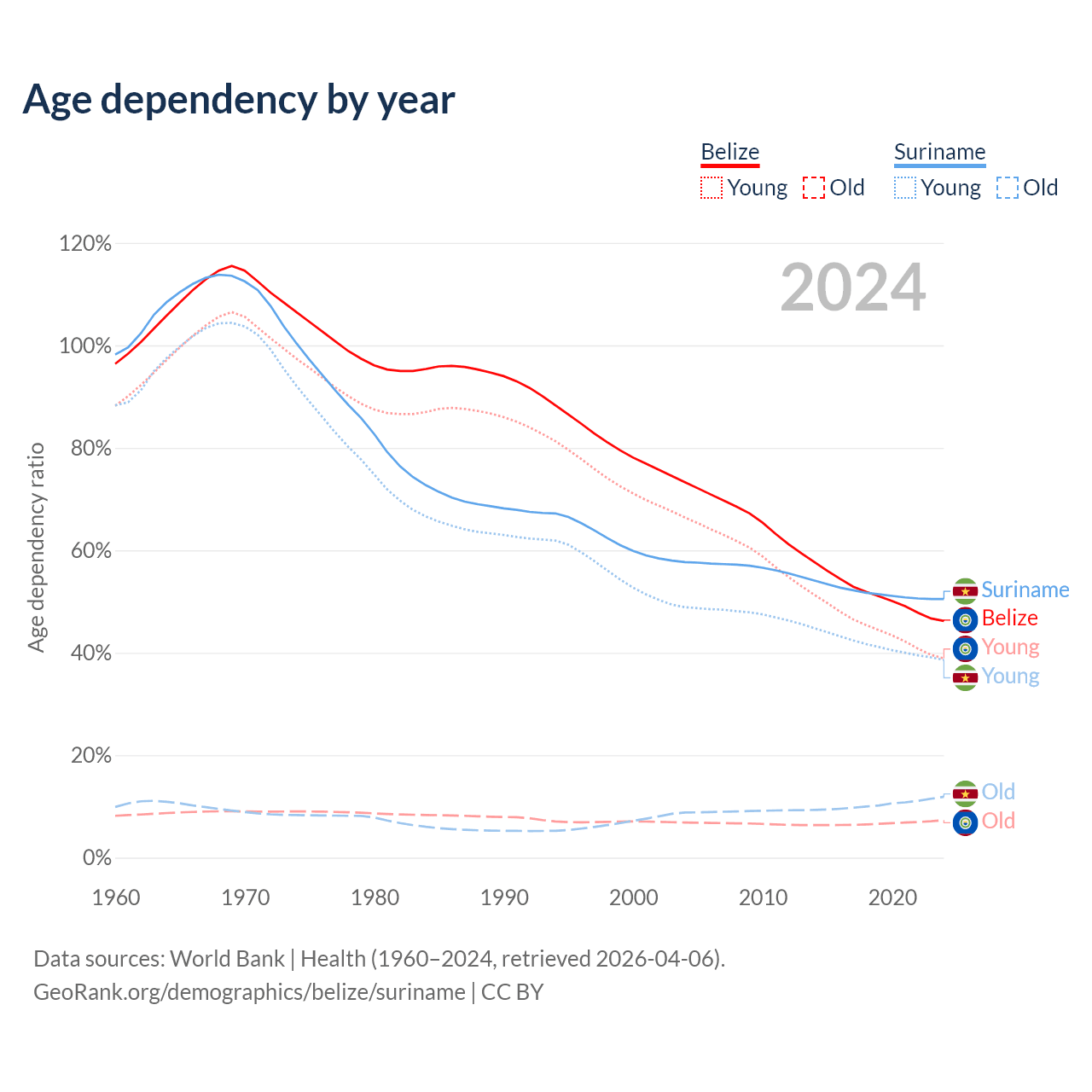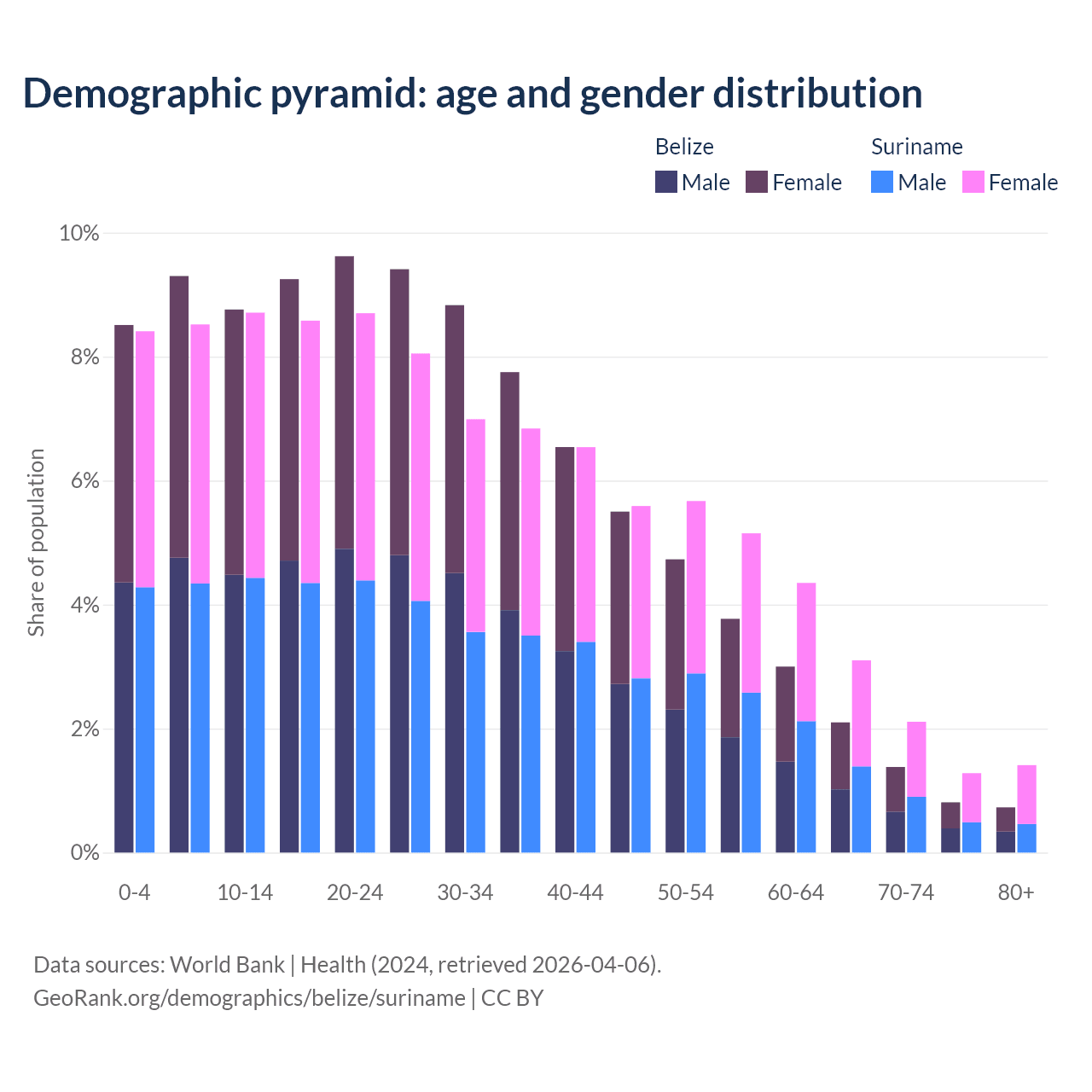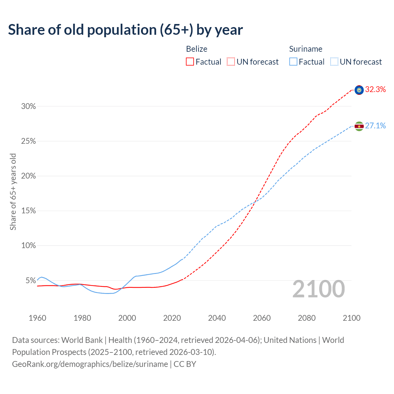 - The share of old-age demographic (65+) in Belize is 5.02% vs 7.9% in Suriname.
