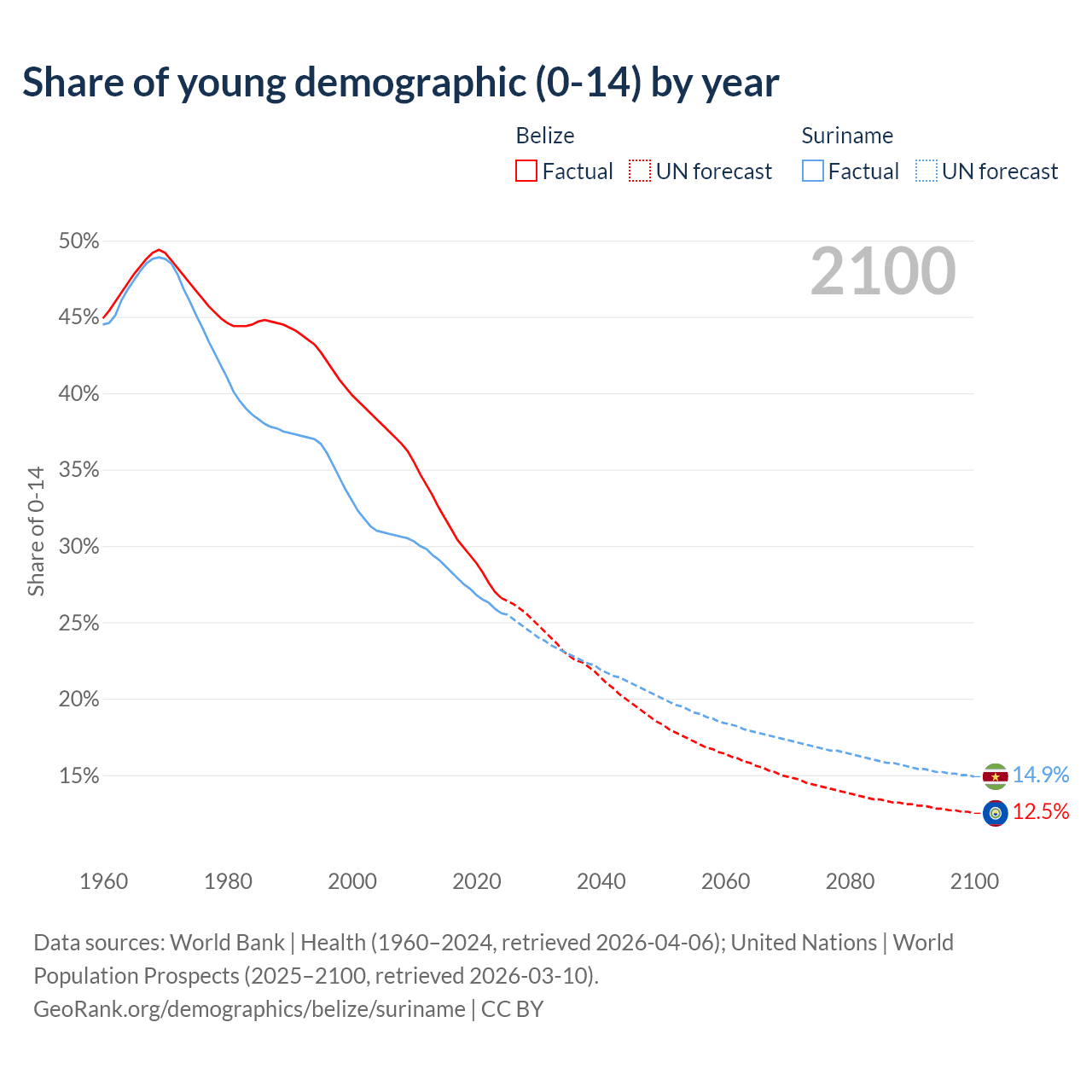 - The share of young demographic (0-15 years old) in Belize is 26.6% vs 25.6% in Suriname.