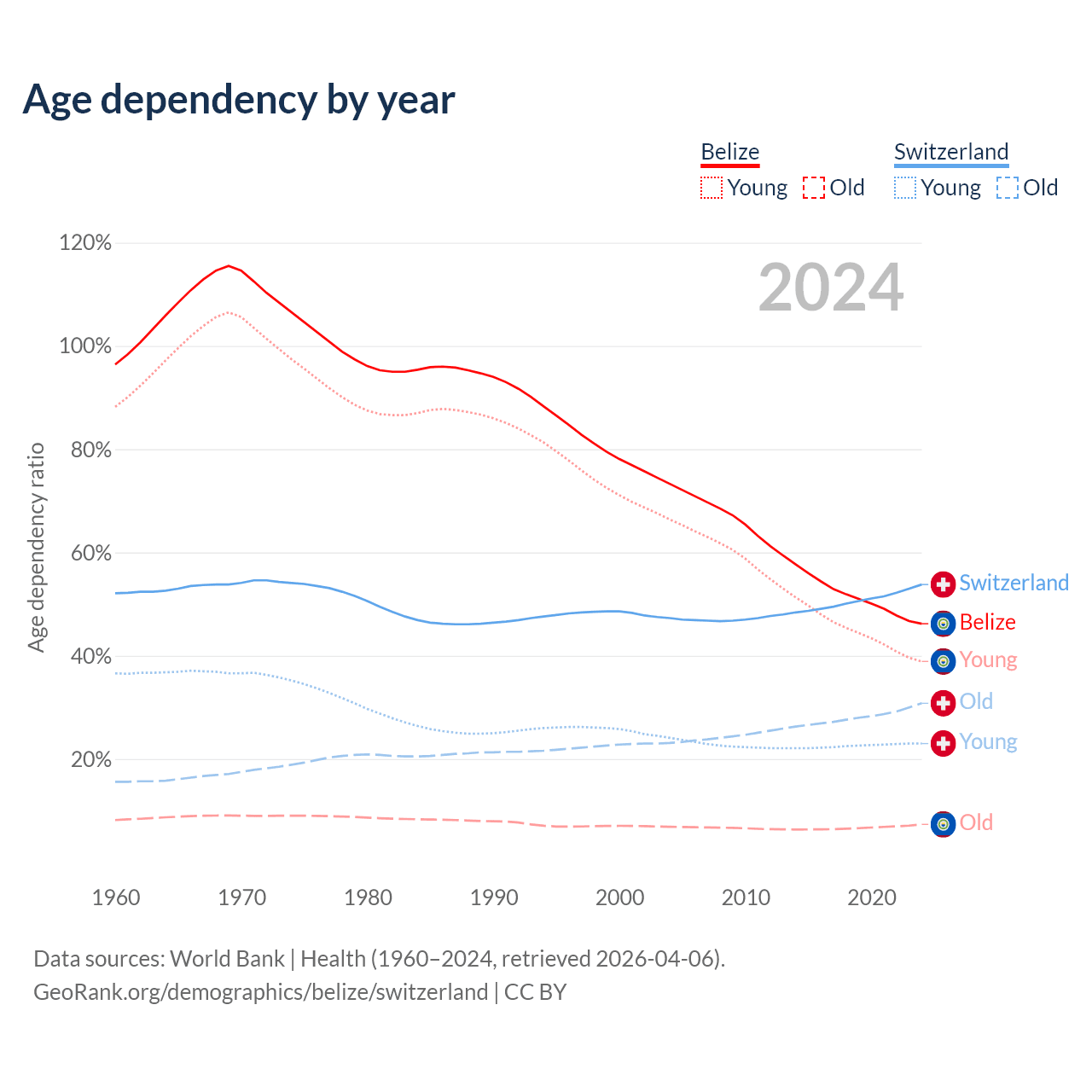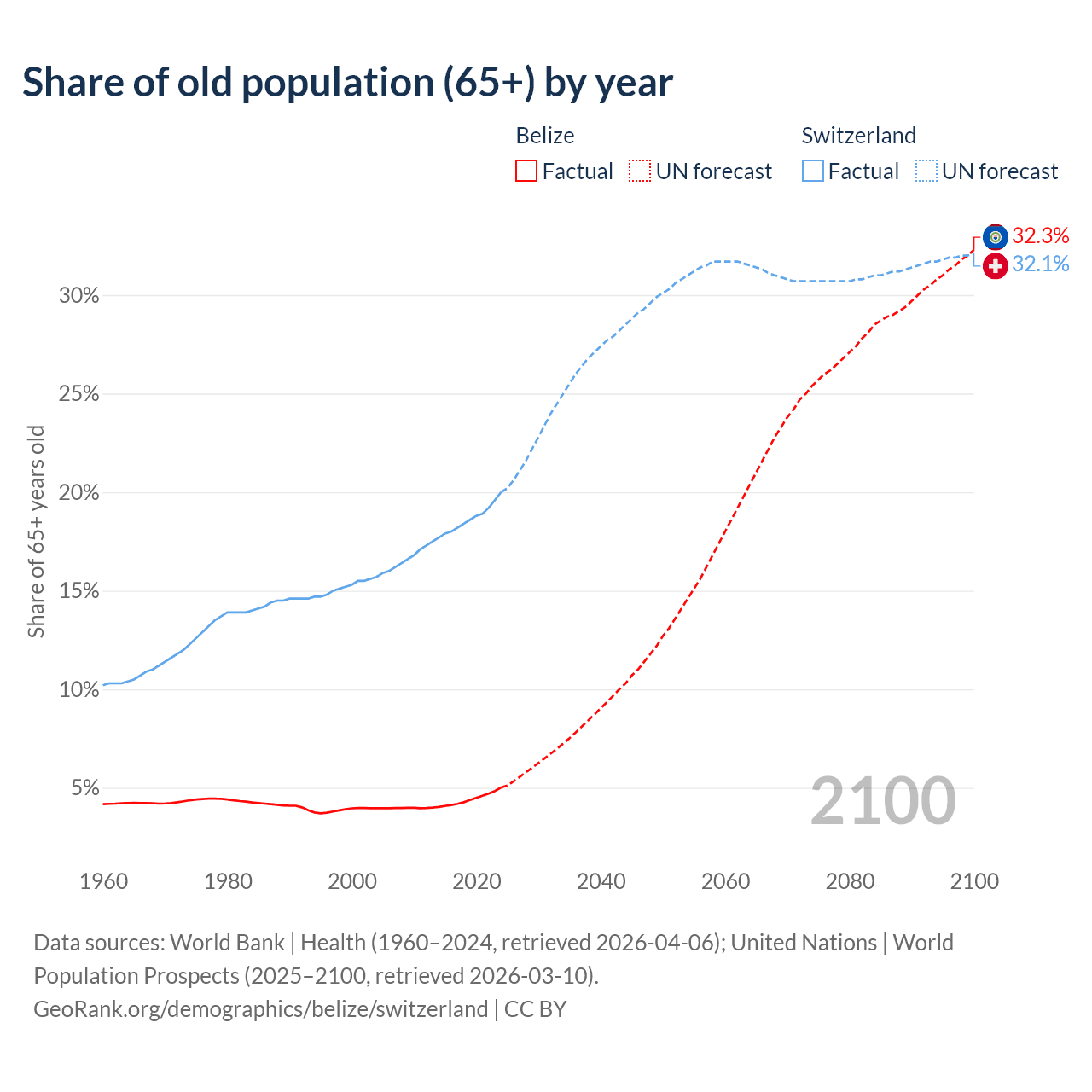 The share of older people aged 65 and over is 5.02% in Belize and 20% in Switzerland. Life expectancy in Belize compared to Switzerland .
