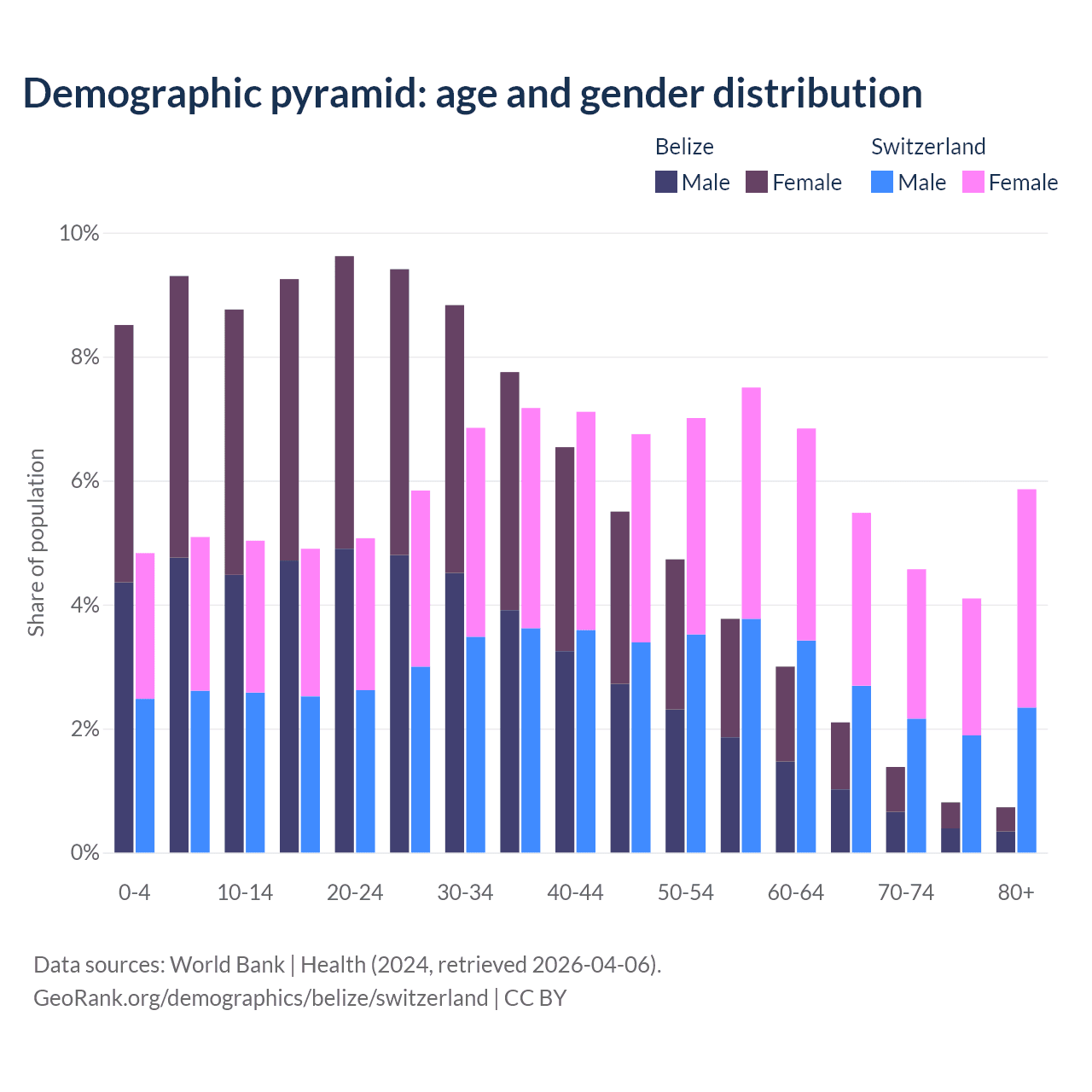 - The share of old-age demographic (65+) in Belize is 5.02% vs 20% in Switzerland.