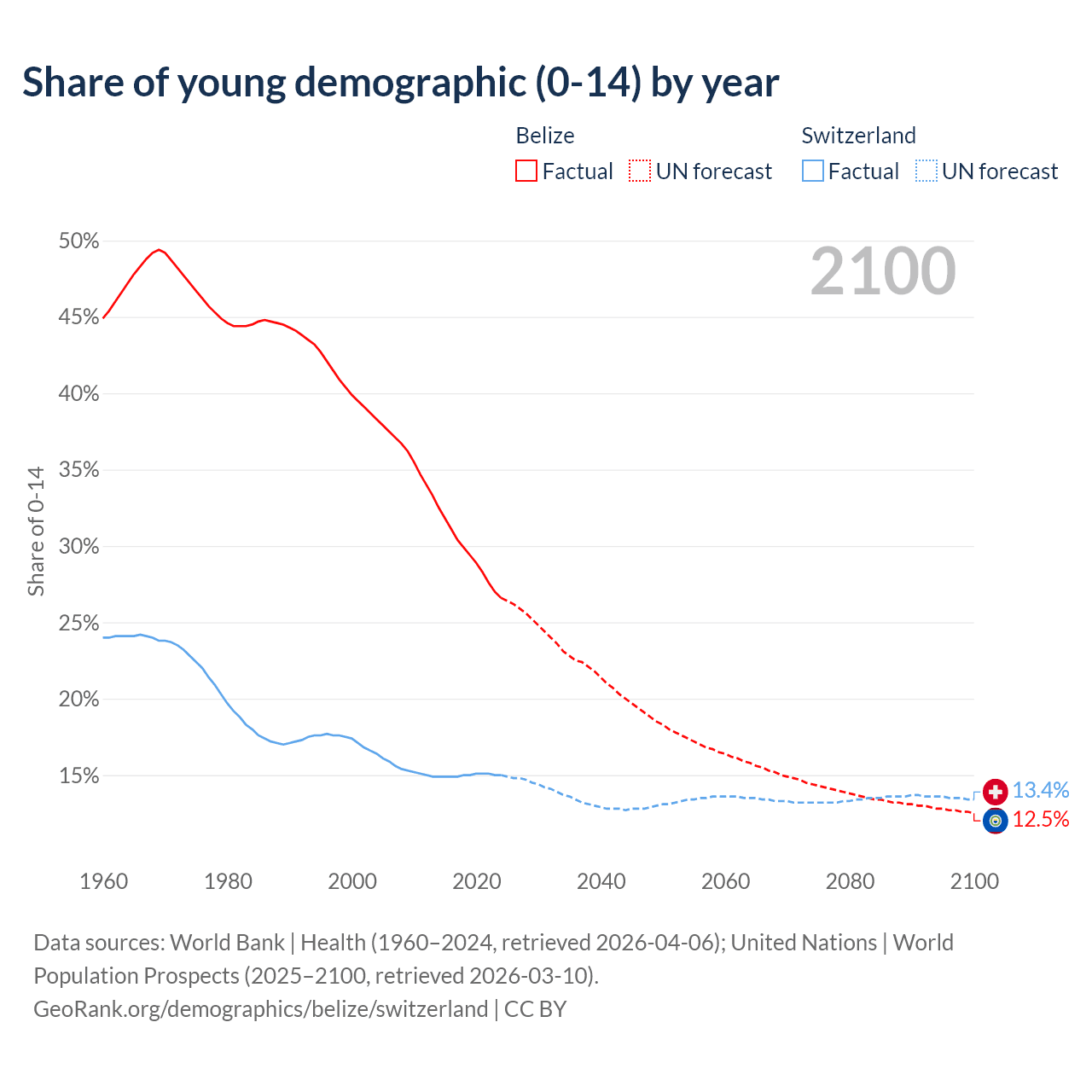- The share of young demographic (0-15 years old) in Belize is 26.6% vs 15% in Switzerland.