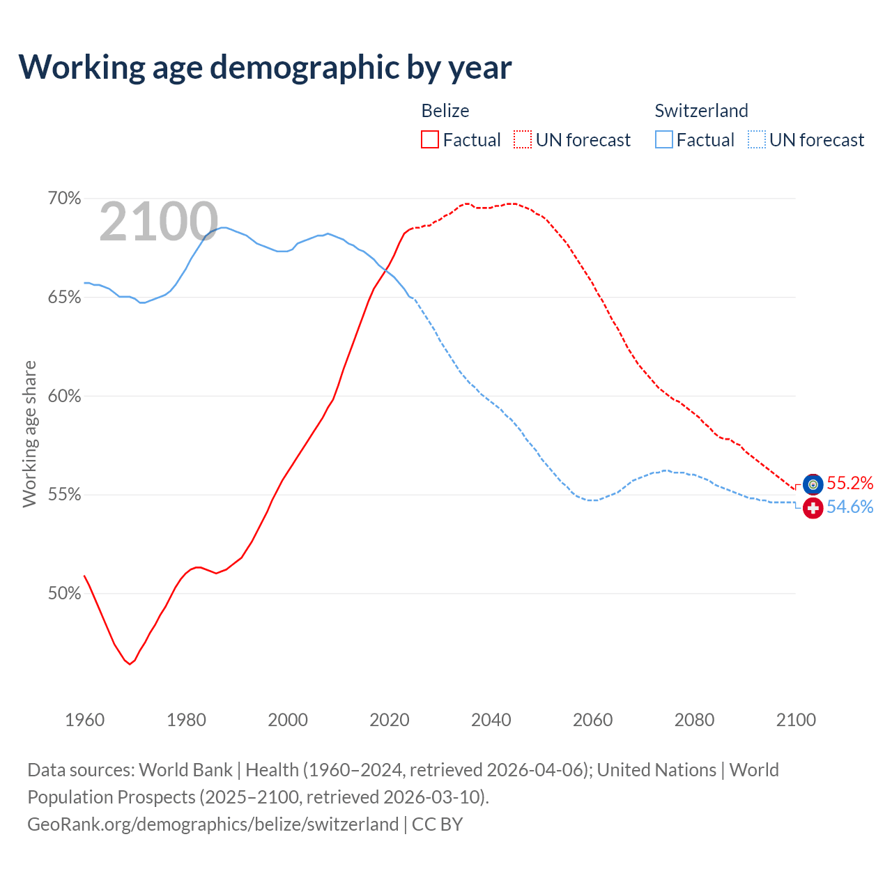 Median age Belize vs Switzerland, 1960-2100