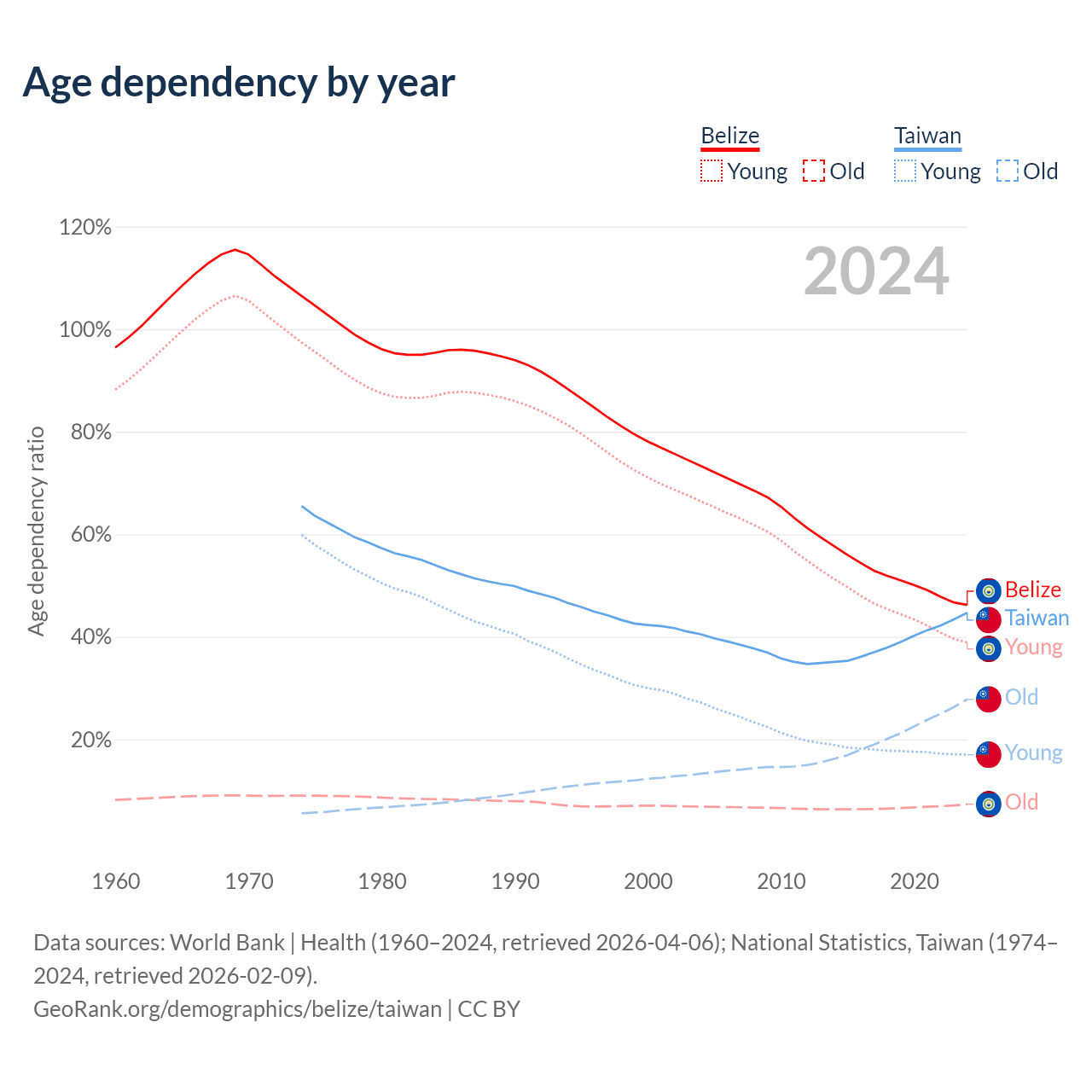 Data sources: World Bank | Health (1960–2024, retrieved 2026-04-06); U.S. Census Bureau (1960–2024, retrieved 2026-02-08); National Statistics, Taiwan (1974–2024, retrieved 2026-02-09).
