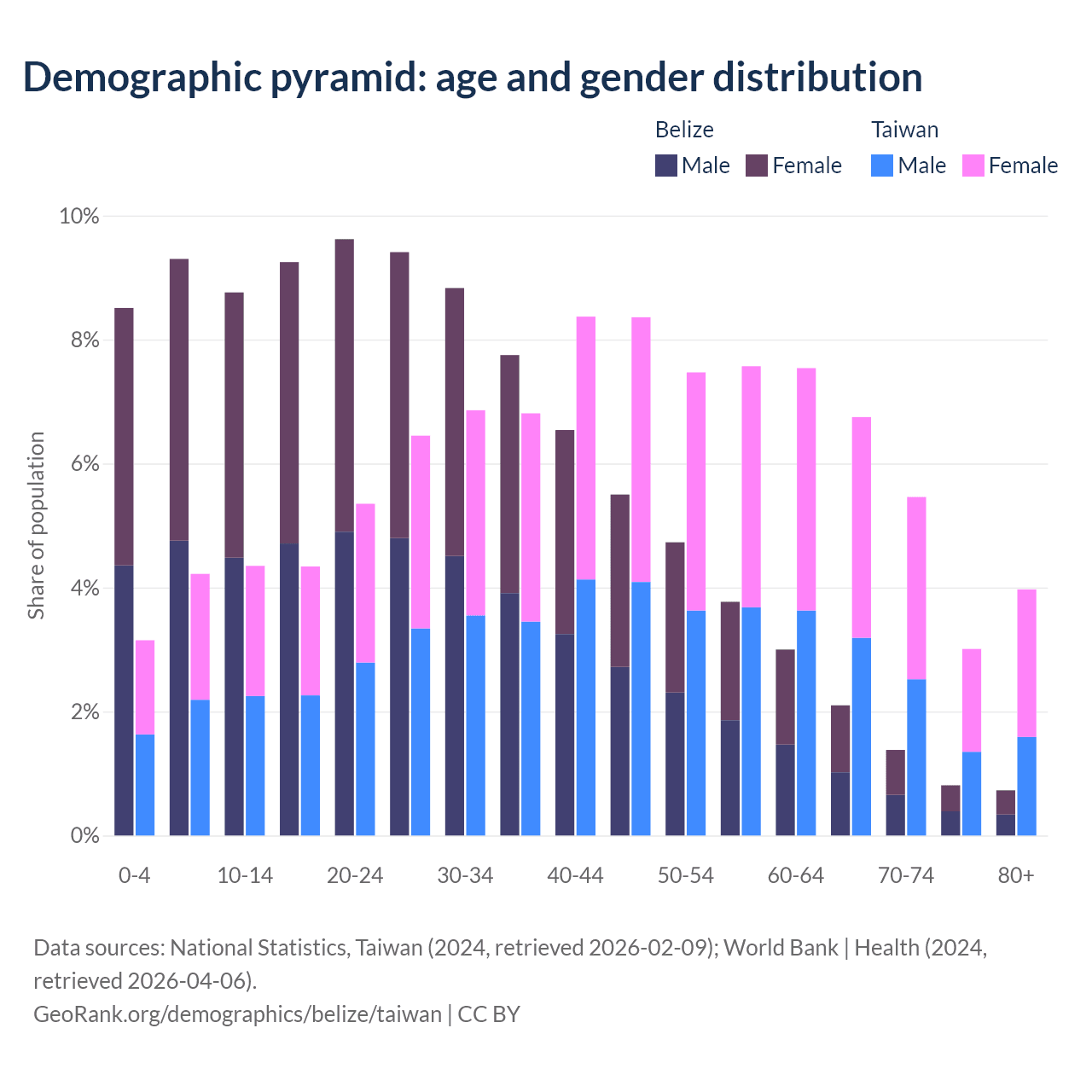- As of 2026, the population of Belize is 430K vs 23.2M in Taiwan - 54 times difference.