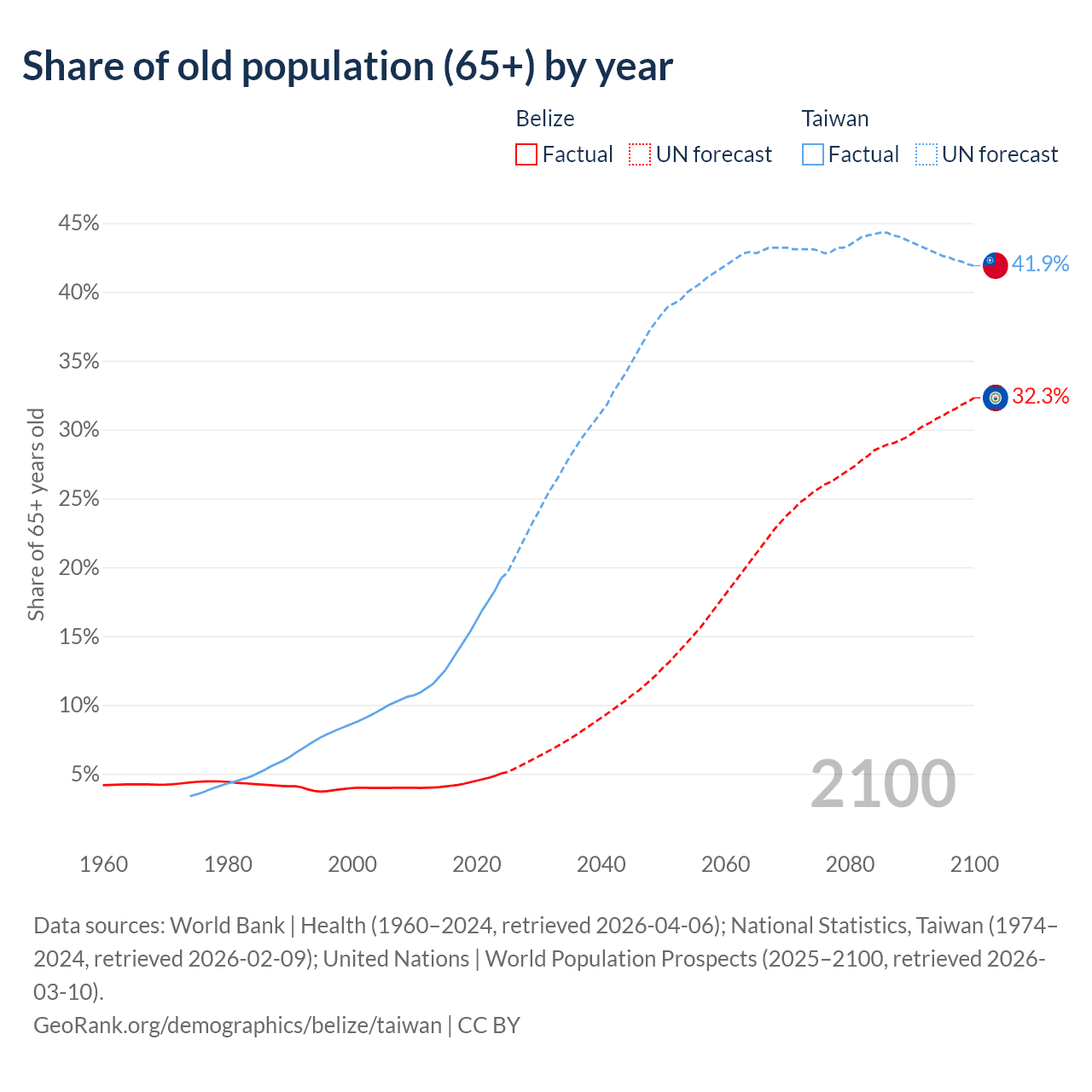 The share of older people aged 65 and over is 5.02% in Belize and 19.2% in Taiwan. Life expectancy in Belize compared to Taiwan .