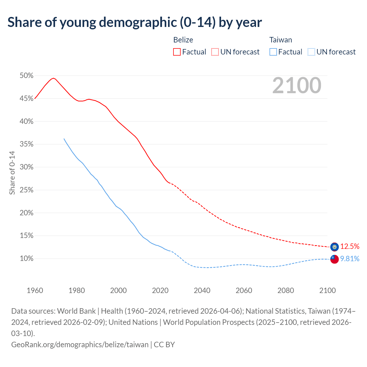 - The share of young demographic (0-15 years old) in Belize is 26.6% vs 11.7% in Taiwan.